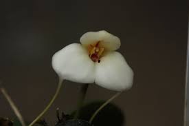На коротком цветоносе развивается единственный, крупный цветок. Окрас цветка белый, с красными прожилками у основания сепалий (лепестков). Сепалии опушенные, покрыты множеством коротких волосков (трихом). Размер цветка (ширина сепалий) около 5–7 см. Лепестки заканчиваются длинными выростами, похожими на хвосты. Они отогнуты назад. Губа некрупная, состоит из двух частей. Нижняя часть подвижна.