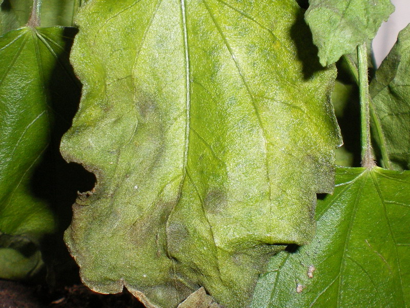 Здоровые листья у гибискустов упругие. Сосудистое увядание у гибискусов не отличается от этого увядания у других растений. Оно вызывается грибами Fusarium oxysporum и Verticillium. Это заболевание часто называеют "гниль корней" но это неправильное понимание проблемы. На самом деле патогенные грибы очень быстро размножаются в земле и проникают в растение по корням. Корни инфицированных растений не показывают никаких следов гниения, кроме самых последний стадий заболевания. Попав внутрь гибискуса, грибы разрушают проводящую систему, нарушая нормальную циркуляцию влаги и питательных веществ .