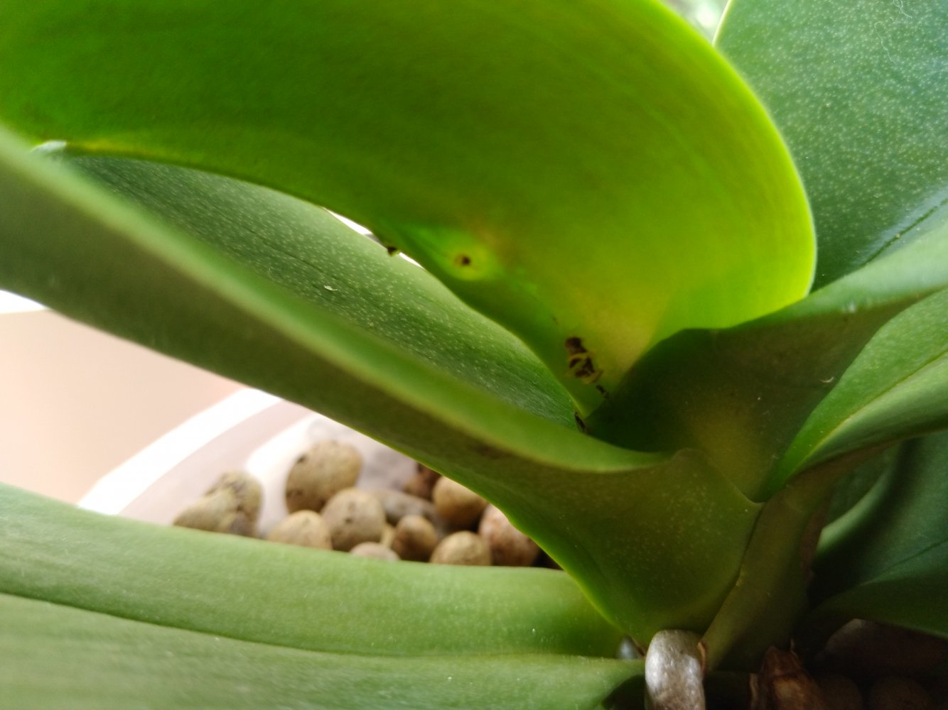 Здравствуйте. Недавно приобретённый фаленопсис. Растёт молодой листик. С обратной стороны несколько выпуклых наростов(как угри на коже человека), через некоторое время будто лопаются - образуется чёрная точка. Что бы это могло быть? Вредители или инфекция? 20210812_140438[1].jpg 20210812_140258[1].jpg