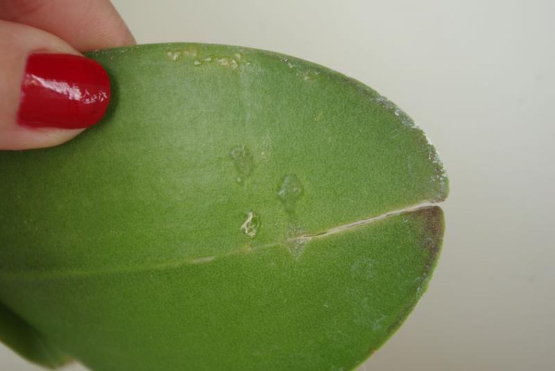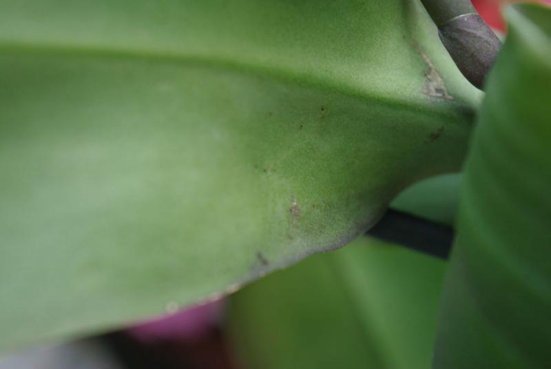 осмотрела все свои фаленопсы и на одном вот что обнаружила - на изнанке листа коричневые точки как бы немного вдавленные и корочка сухая одна есть светлая. а другой лист неравномерно окрашен. Что с ним?