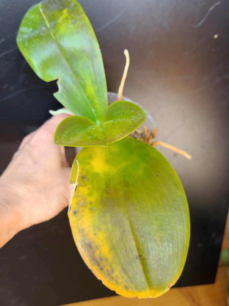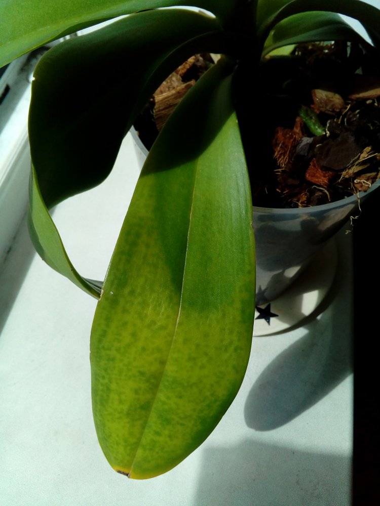 И вопрос к вам в основном, у Вас опыт! , подскажите пожалуйста, тут, правда, про листья, а я про корни. Есть у меня ЛекоФантастик, с очень странным поведением корней, посажен в кору, на поверхности мох сухой корочкой, внизу дренаж керамзит, горшочек арте, двойной. У меня он год, с размера 1,7, второй раз цвести собрался, цветонос вырастил уже прилично, за это время 3 листа вырастил, каждый больше предыдущего. Но вот корни очень хорошо растит по поверхности мха, и на воздухе, вьются там корни в этом верхнем слое, кончики длинные растущие, красивые (иногда обрызгиваю его, редко), а внутри горшка всегда какое-то затишье, закукливаются, что-то тоненькое мизерное вроде хочет вырасти, тянется полсантиметра ниточки и опять закукливается. Замачивание с просушками, пролив по краю, пробовала высушивать почти до чуть сморщивания корней(верхних), тургор листьев не терял при этом ни разу - не заметила изменений. Пересадила - корни с верхнего слоя в грунт опустила, корманы воздушные более чем хорошие, водой в последнее время поливаю 60 ppm - то есть практически дождевая, редко до 120ppm - думала засоление ему не нравится. Вот загадка!