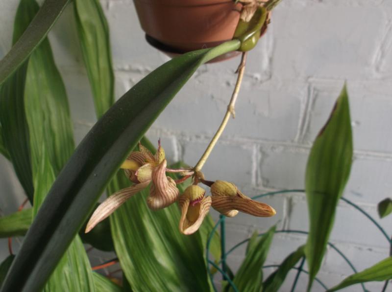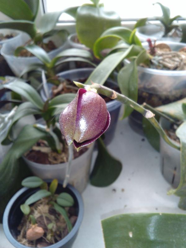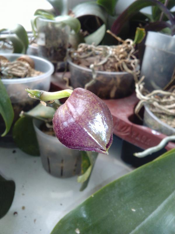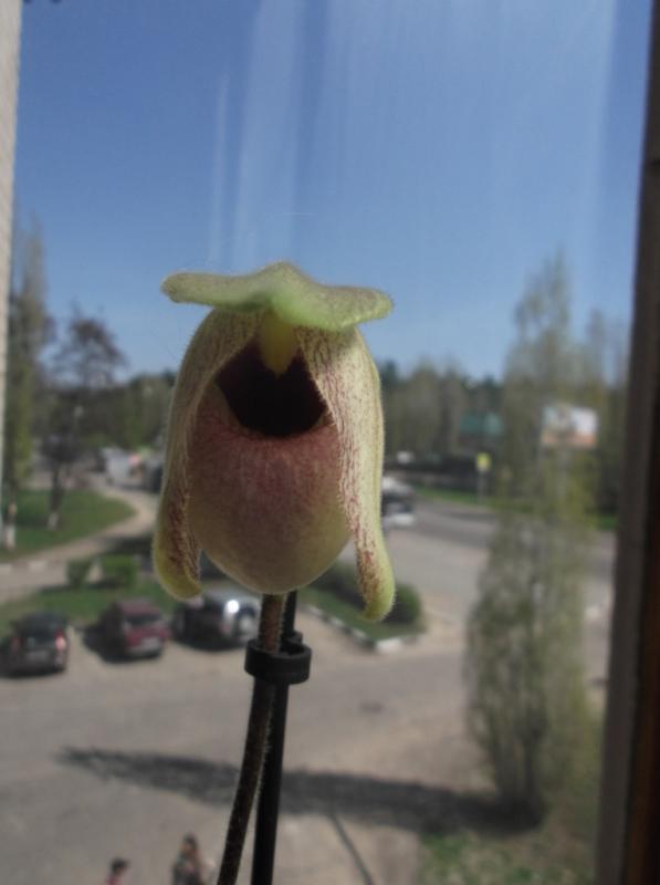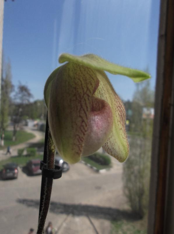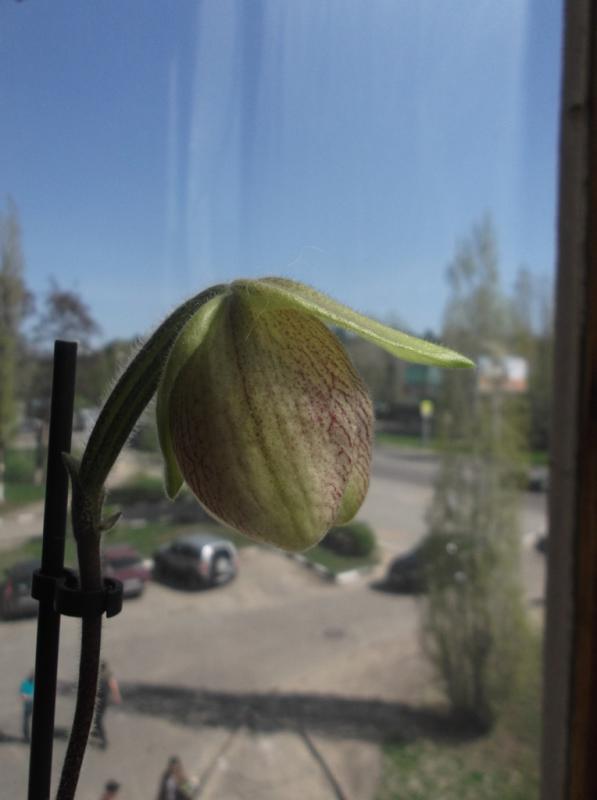 Распускается вот такое чудо. Приобретался под названием Paph. micranthum x delenatii, однако явно не он. С нетерпением жду полного роспуска. хотя и не то, что заявлено. :)