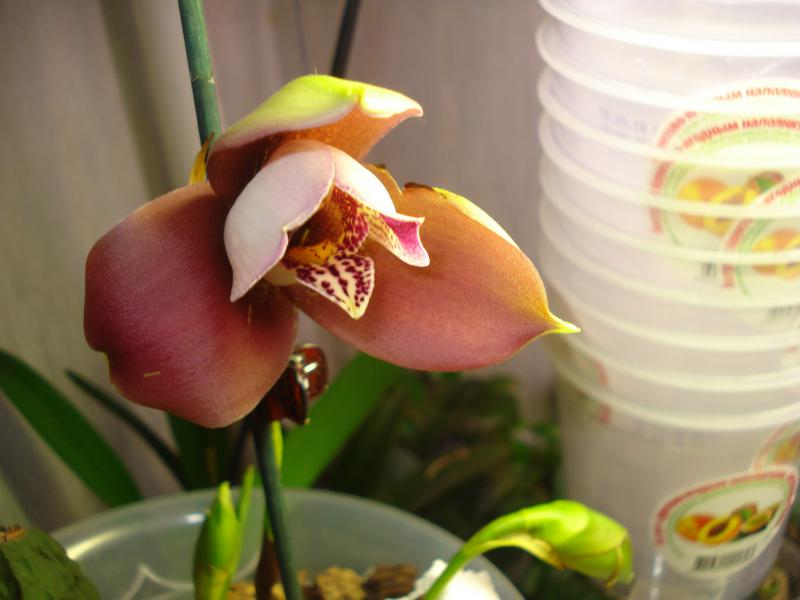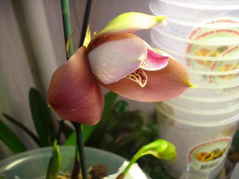 Ликаста янг сакура в полуроспуске красотуля от флоракультуры полученная в декабре пришла с пипками цветоносов (извиняюсь за банки :)): на них лампа стоит)