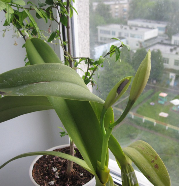 Тфу-тфу... Katusha, трудно сказать... Капризные оне... Вообще-то на этой моей ликасте (ароматика) всегда бутоны появляются чуть позже крупной набухшей почки нового роста. Всё это безобразие развивается одновременно, и цветение наступает регулярно летом (в июле, но сейчас я жду в июне), когда новый рост достигает трети-половины максимальной длины. В то же время, ещё одна ароматика, от Акерне, цвела, когда новый рост был не выше бульб. Круента у меня цвела с полностью развёрнутыми листьями нового роста, а в инете полно фотографий, где она цветёт без листьев... так что и у тебя, может, есть надежда. Если бутон не хочет (не может?) развиваться, он чернеет...
