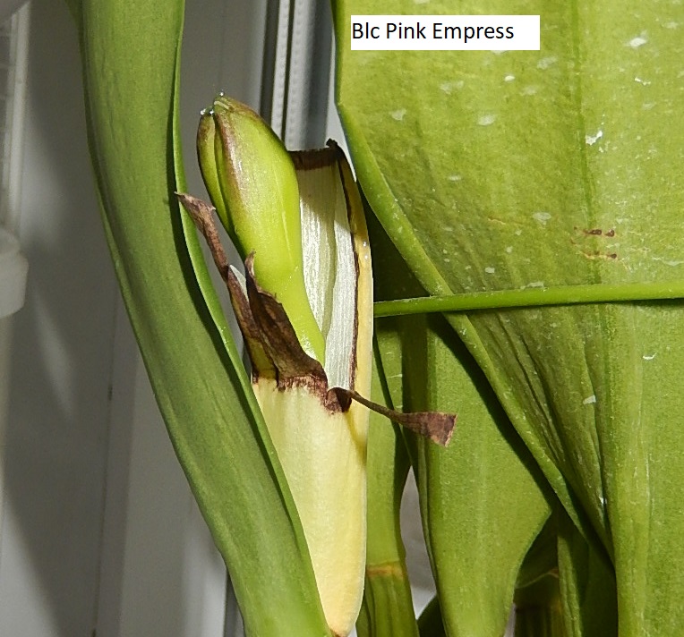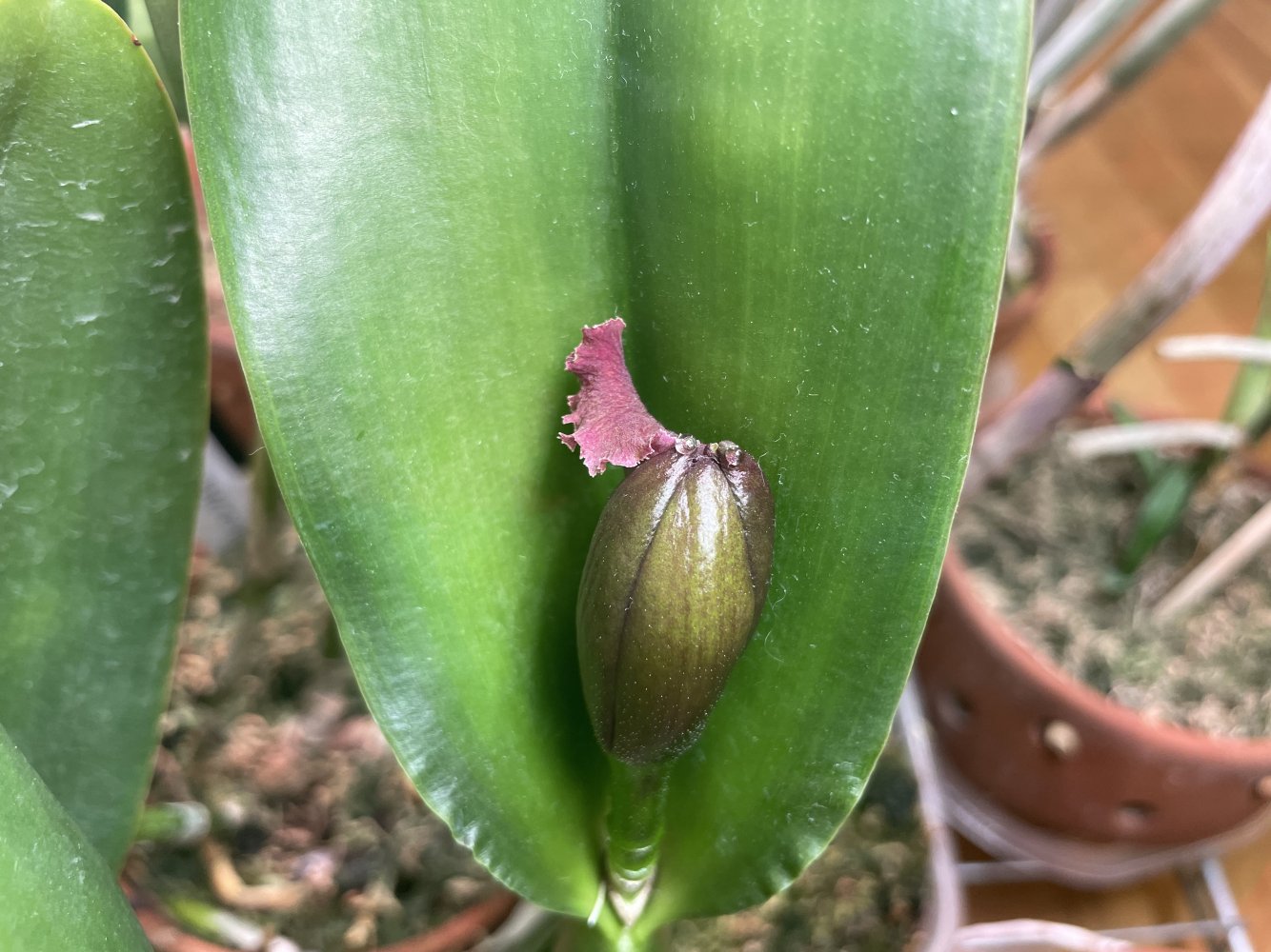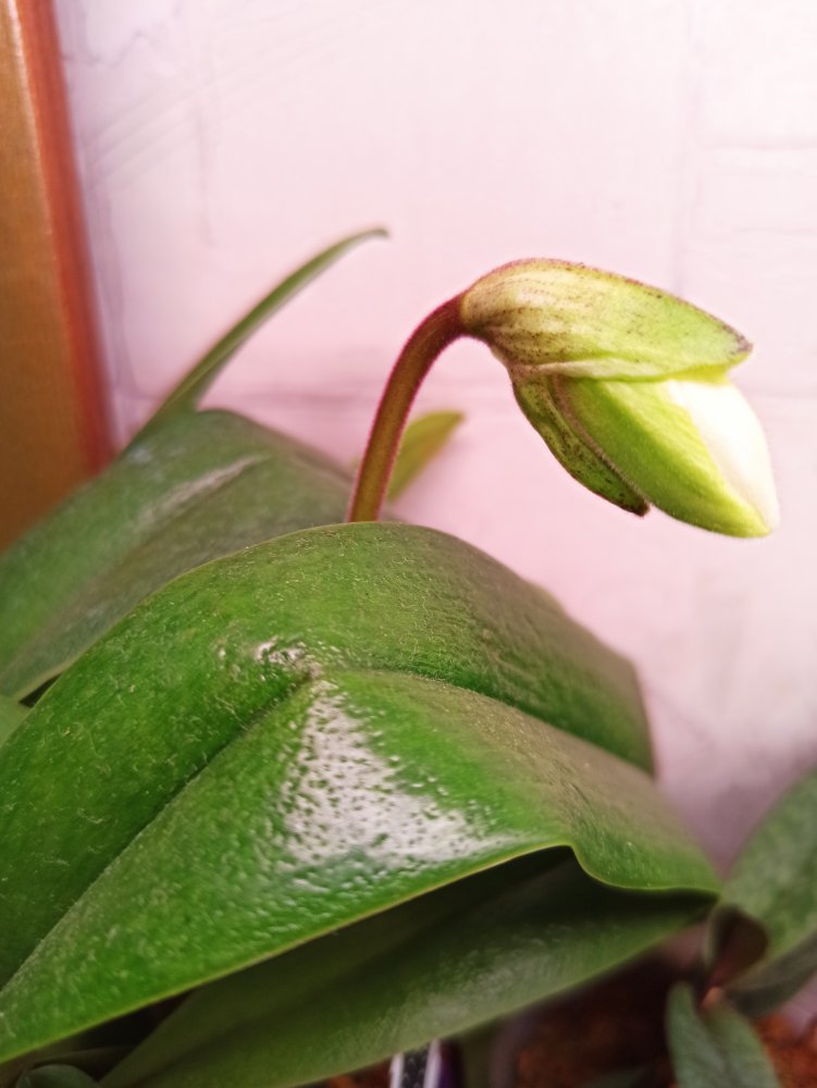 Уже больше недели жду пока раскроется бутон Paph. Rosy Dawn. Получала его в конце октября 2019 г от Швертера в размере 9см, с тремя розетками. Процвел первый раз в начале 2020 года, пересажен в горшок побольше, 12 см, потом активно наращивал новые розетки.