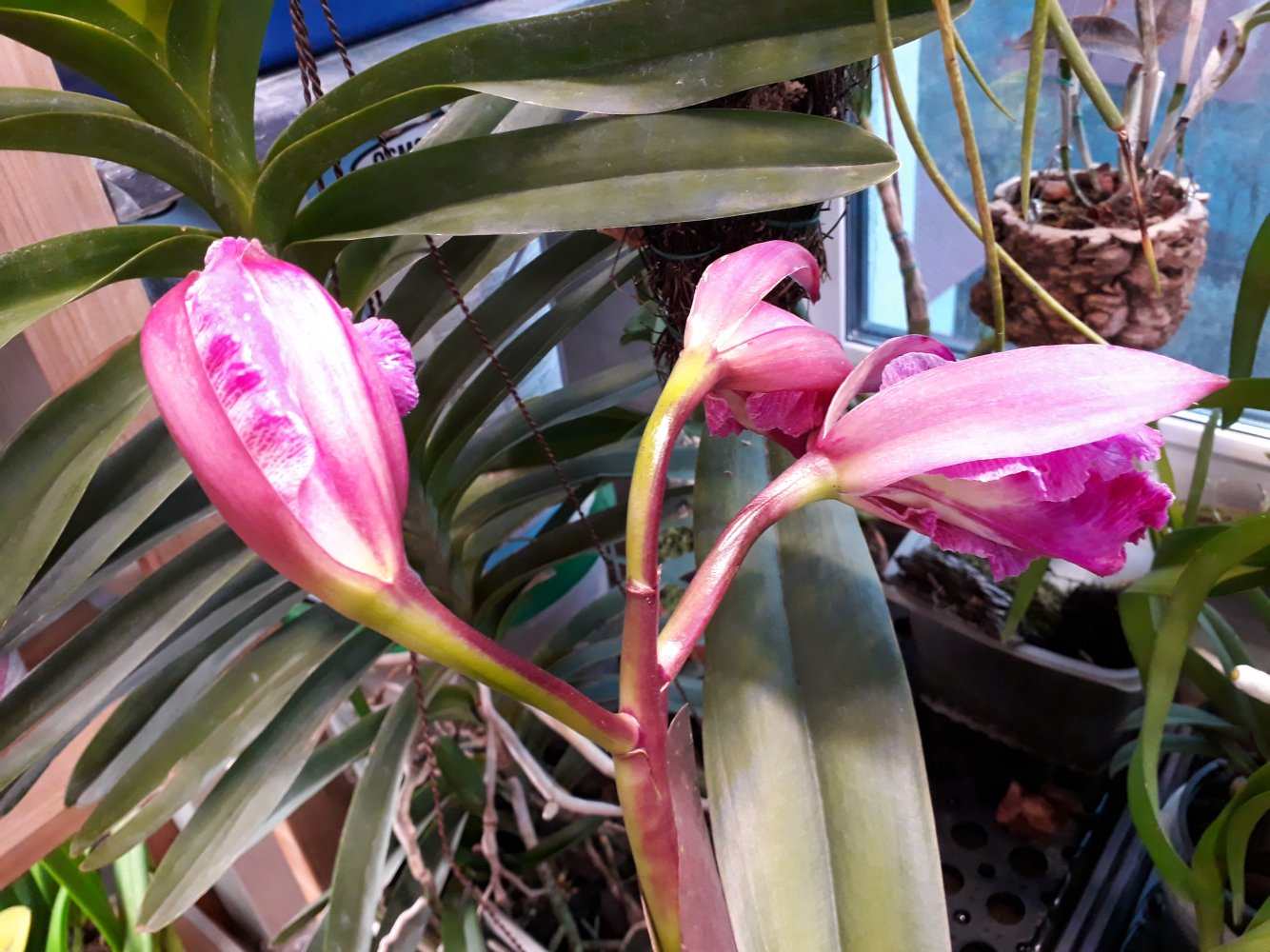 Ура, ура, ура-а! Я научилась зацветать цимбидиумы! Лет 20 назад мне муж начал дарить орхидеи на 8 марта, в основном, цимбы. Но они, отцветали, потом чахли, чахли, и гибли. Мы жили тогда в городской квартире, условий для них создать не получалось. Теперь, мы давно живем в коттеджном поселке, в своем доме, а завести снова цимбидиумы решилась только два года назад. Год ушел на адаптацию, и вот! У меня сейчас 4 цимбидиума, все с цветоносами. А это-самый большой из них, cym. Lovely Sweet Melody, от Эквагенеры.20211218_111335.jpg