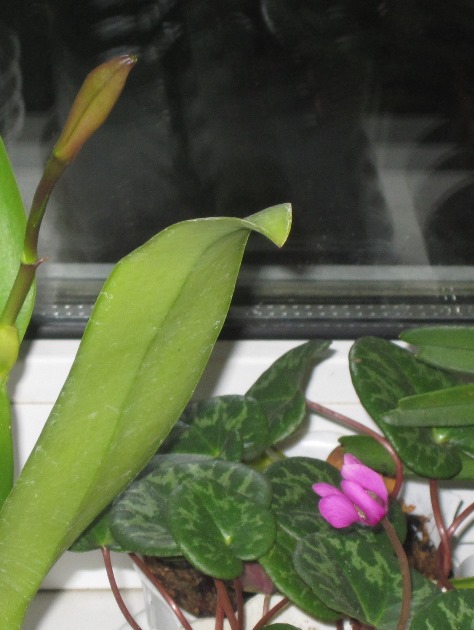 Бутончик формируется на совершенно коротком, длиной всего 2 см, цветоносике. На фото и то длиннее, чем на самом деле.