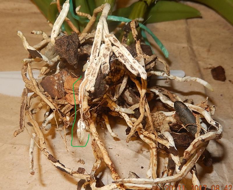 фото самих корней, зелёным обведён корень что прирос к глине и повредился при вытряхивании.