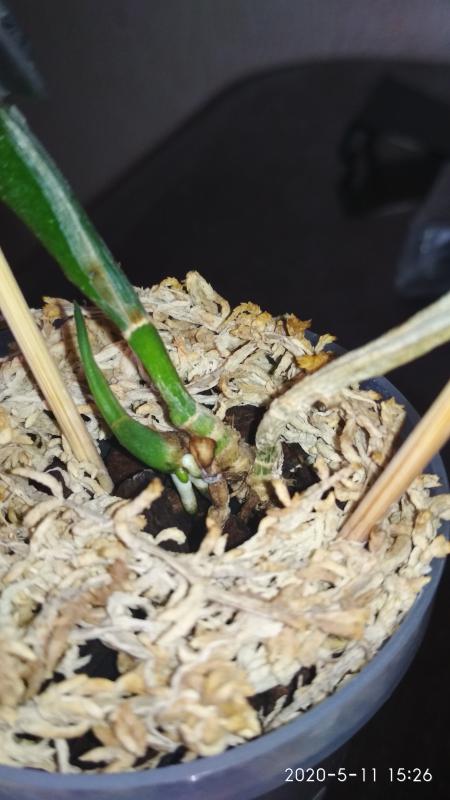 Корней у нее -все что на фото. Ростик вот так вырос и замер. Корешки с него , судя по старым фото мизерно, но растут. Сидит на коре. И в большом кашпо с водой на дне. Мох каждое утро опрыскиваю водой. Какой сорт не знаю. На вид мини. Мне ее в таком состоянии и отдали. Вторая бульба осталась с одним листом и ооооочень сухаяIMG_20200511_152605.jpgIMG_20200511_152611.jpg