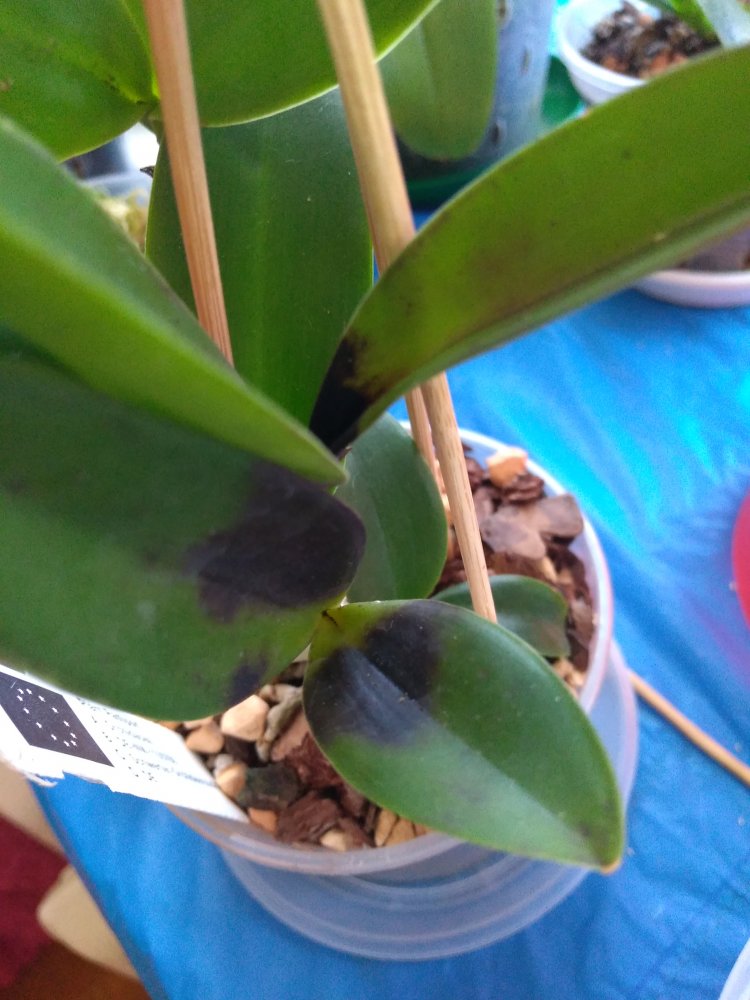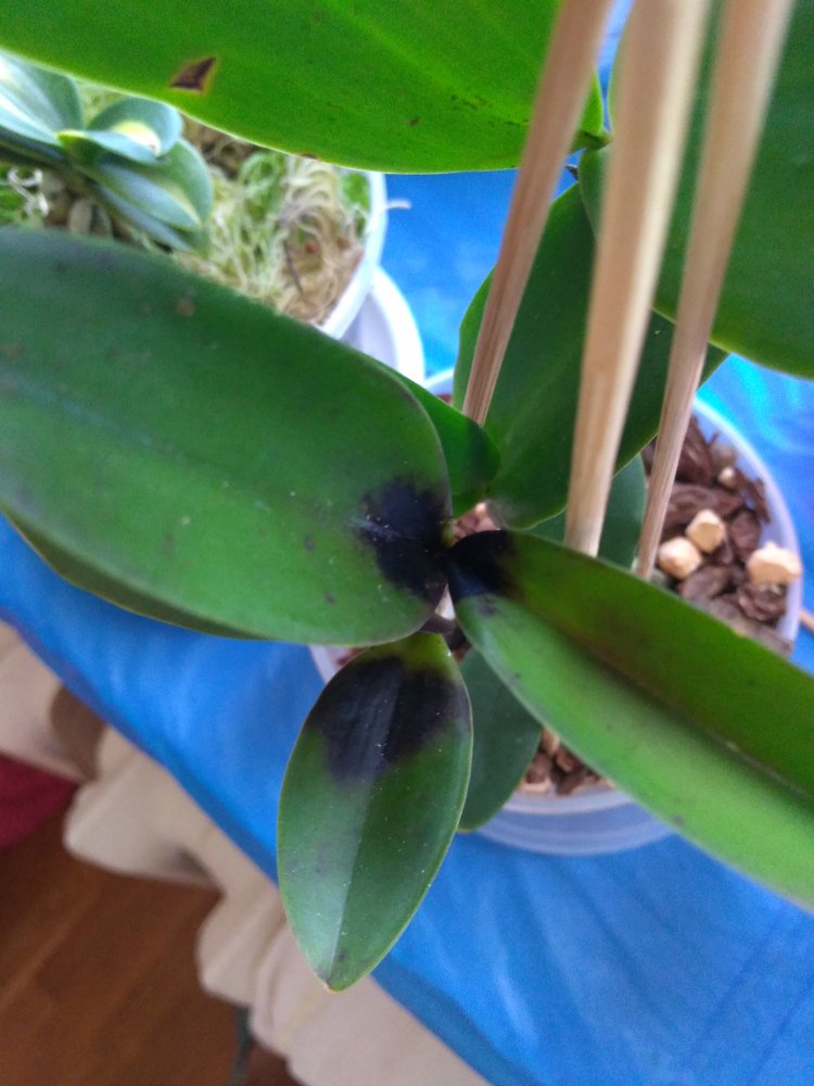 Подскажите, пожалуйста, как с этим бороться? Что это за зараза и как спасти каттлею? Нижние маленькие листики уже сняла, полностью почернели и опали. Причем тургор не теряется, листья плотные, но черные