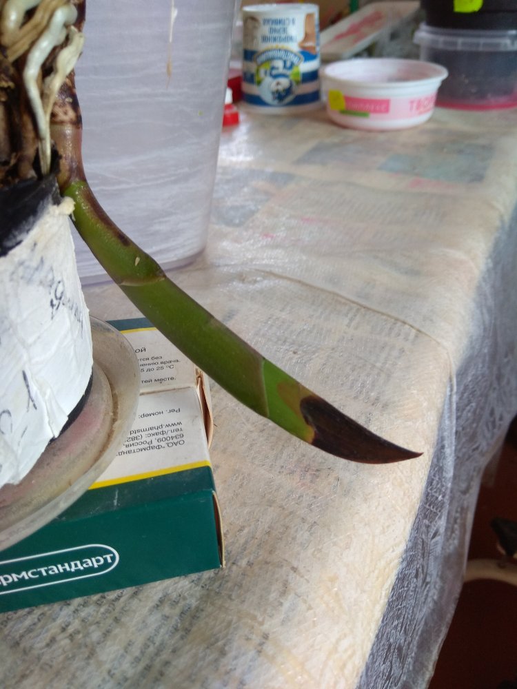 Здравствуйте! У двух каттлей верхушки молодых ростов потемнели. На первом фото- поверхность пятна сейчас гладкая, на втором- уже впадинка(но пятно сухое). Вторая каттлея падала. Каттлеи стояли в разных местах. Подскажите, пожалуйста, причины и что мне делать. СПАСИБО ЗА ПОМОЩЬ!