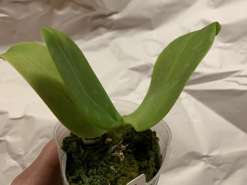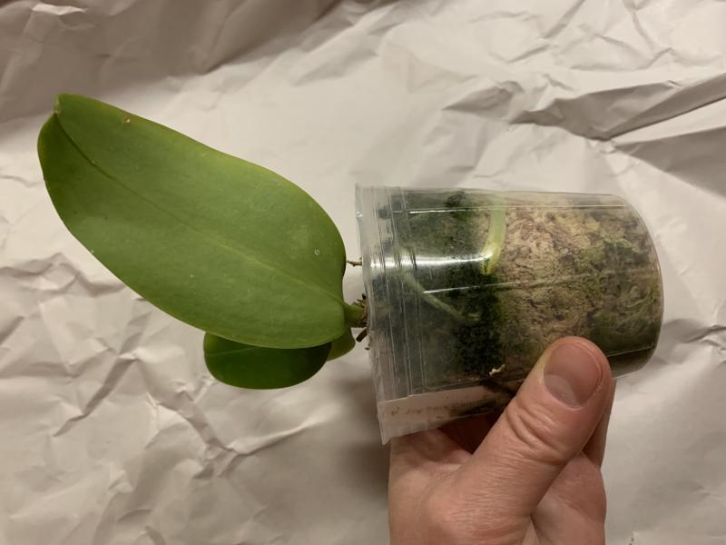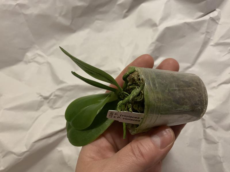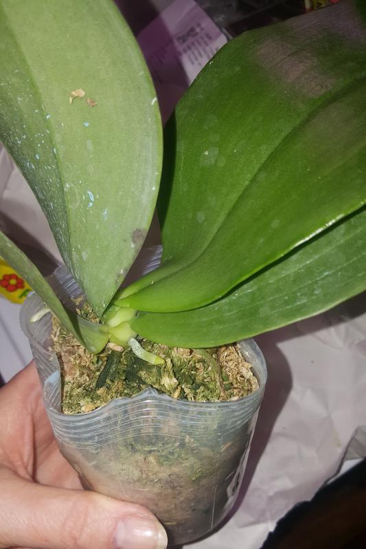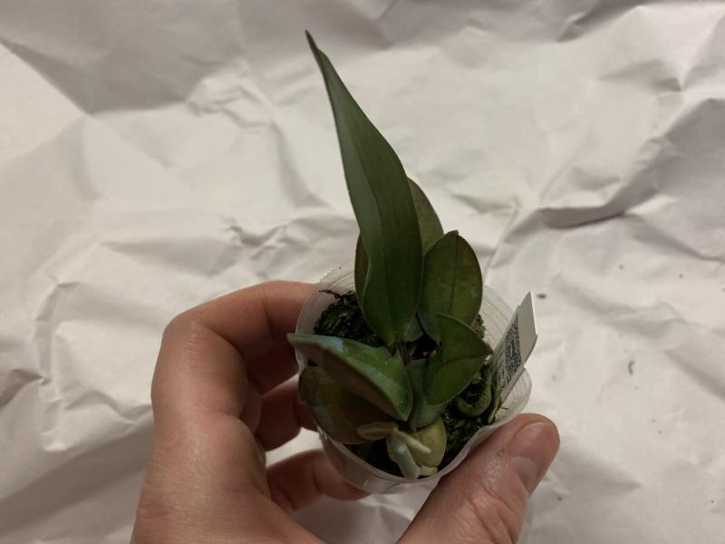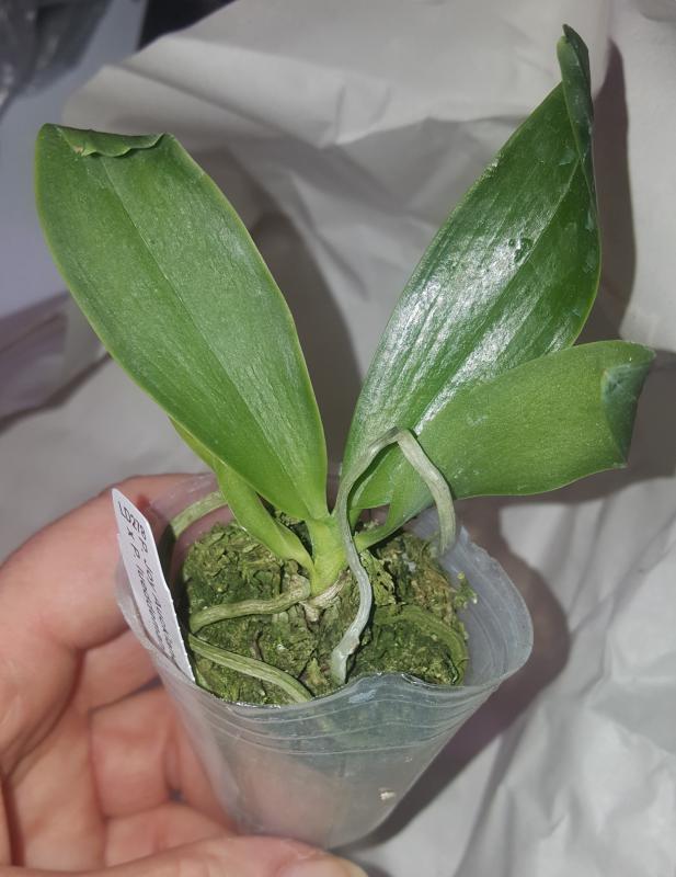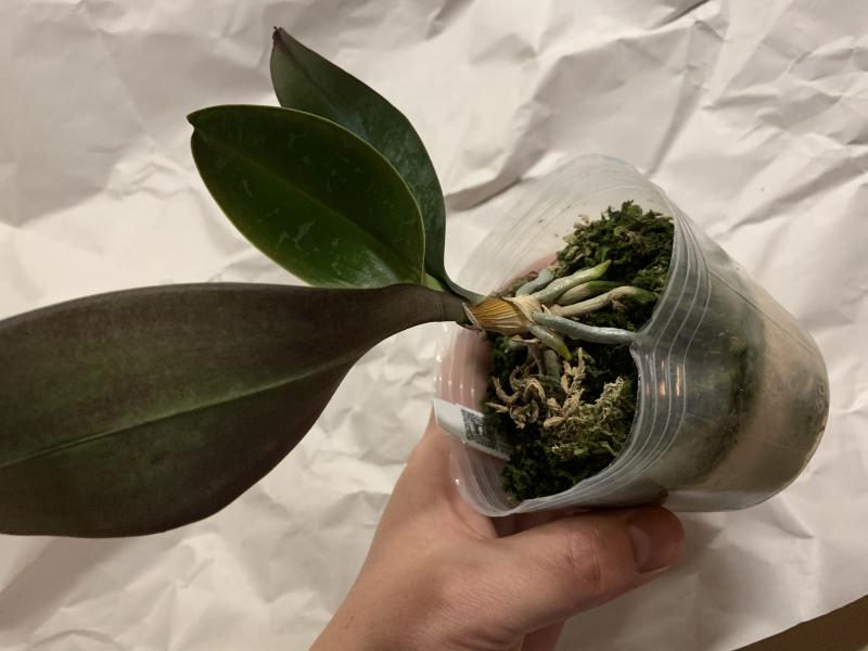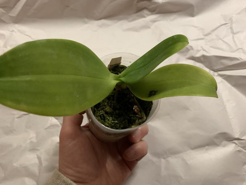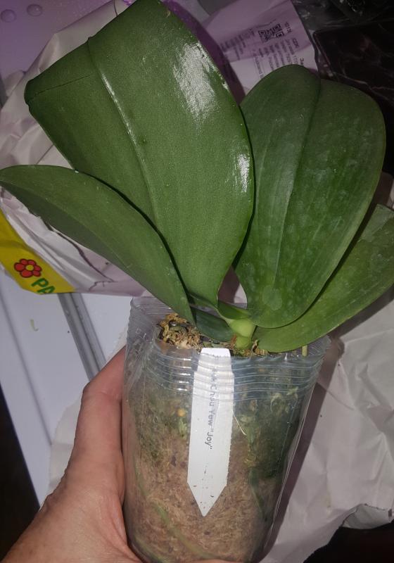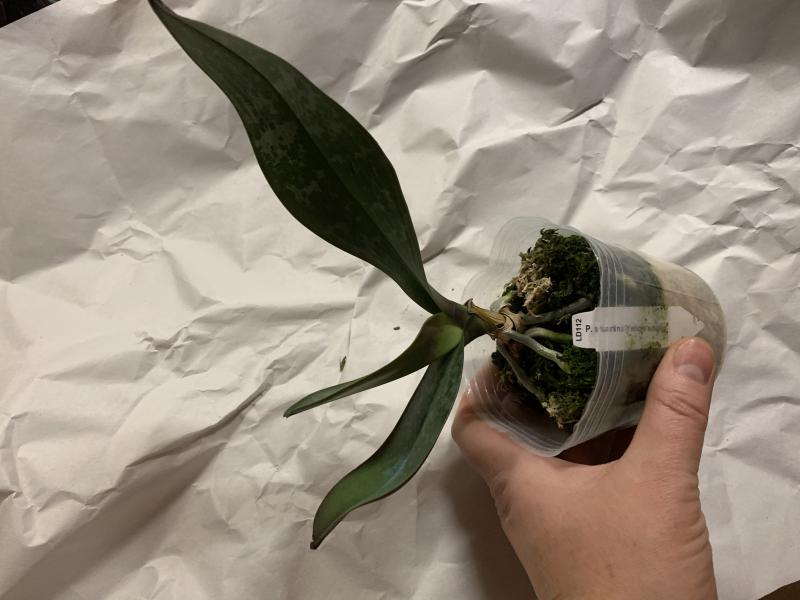 Растение пришло полноценного размера 2,5! что было приятным сбрпризом, мох был полностью сухой. В горшке имеется бирка, что немаловажно! Корней много, правда есть и неживые корни. Четыре жирных листика, вместе с растущим, размеры самого большого листа 10см-длина на 5см-ширина. Листья почти без повреждений. Также у растения виден старый засохший цветонос. Впечатления от растения очень приятные. Спасибо!Спасибо!