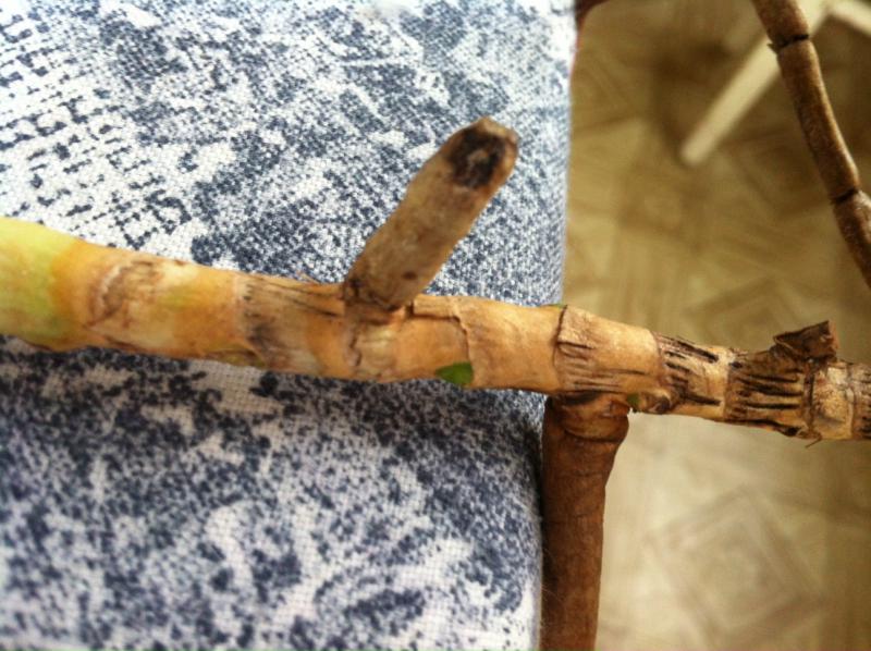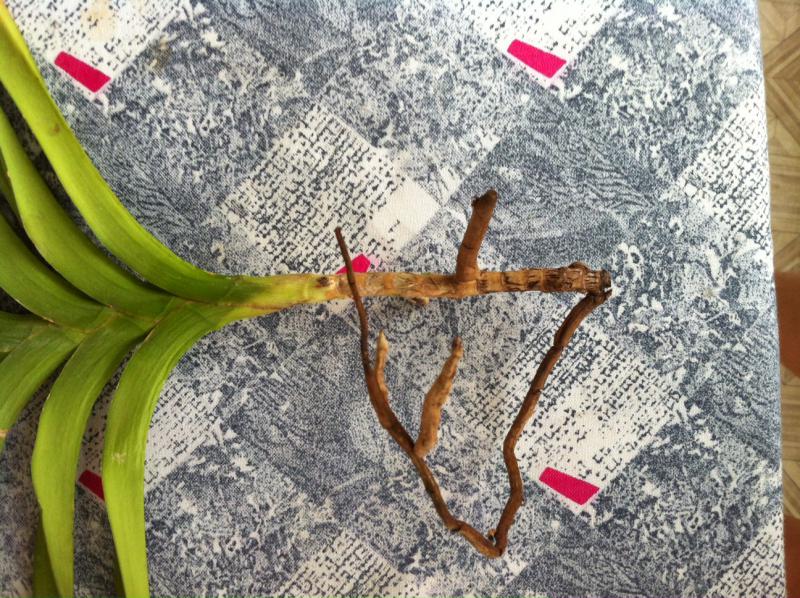 Вторая с длинными корнями более засушена, у неё нижние листья и ствол в морщинках. А на первой новый цветонос засох.
