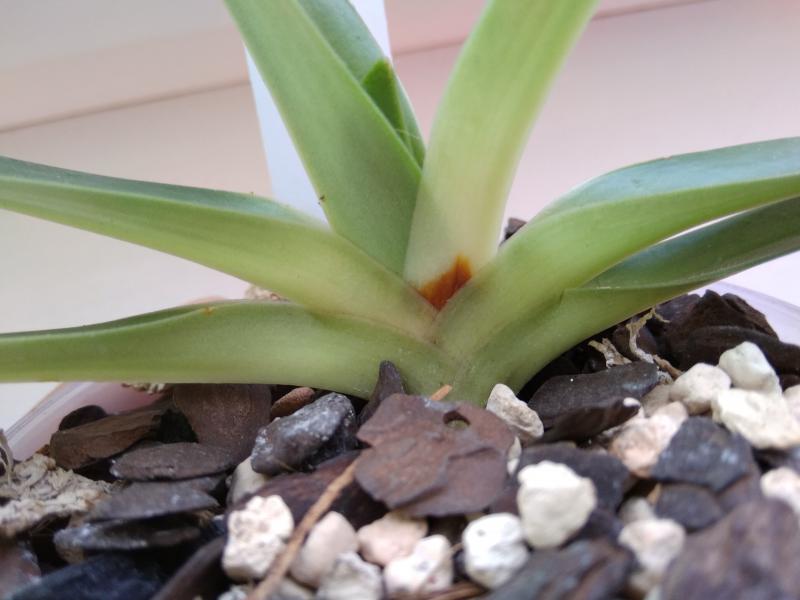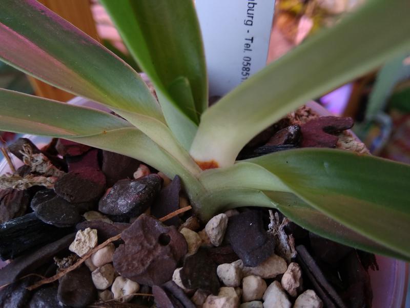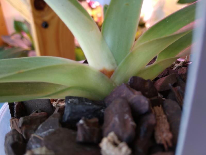 Здравствуйте! В феврале получила паф St. Swithin. Посажен в орхиату+мох+Коко чипсы+кремневит. Поначалу ему нравилось и стал активно растить центральный лист. Но буквально на днях заметила рыжее пятно в основании листа. Если отогнуть листик, то рыжина уходит в глубь розетки. Рыжина растет. Дайте совет что это и как с этим бороться?