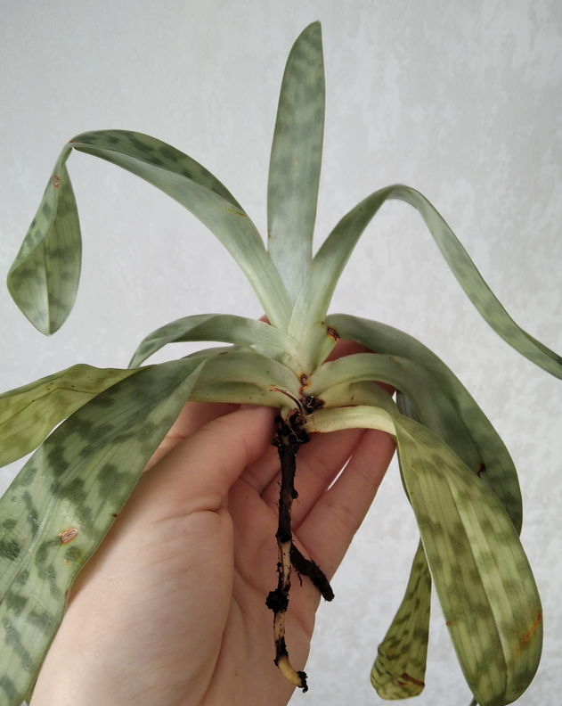 @Sparkle, прямо вчера описывала, как умирает паф, сколько это по времени занимает... Так вот, на фото паф уже умирает несколько месяцев, ему осталось от силы месяц, дальше все, конец. Да и сейчас без опыта уже вряд ли его спасете... Поникшие листья - корни давно отмерли, много месяцев назад. Растение не пьет, поедает само себя, нарушены все процессы, в том числе фотосинтеза, из за этого цвет бледный. Толку его было поливать, если ему пить нечем, только драгоценное время потеряли. Последнее что сейчас можно для него сделать - доставать, убирать все отмершие корни. Начавшие расти самые верхние корни, которые остановились в росте, еще живые, если твердые. Продолжать расти они уже не будут, это не фаленопсис. Но будут хоть как то питать растение. Поэтому их нужно сохранить. Дальше замочите растение целиком перед посадкой в растворе Аминозол и Рибав (5 мл и 4-5 капель на 2 л воды) плюс туда же добавьте столовую ложку сахара. Подержите растение не больше 10 минут, а затем переверните его "вверх ногами" на бумажное полотенце, чтобы вода стекла и оно хорошенько обсохло. Затем его нужно посадить в маленький горшок, по размеру как азиатский 2,5 в один мох. Если есть живой сфагнум, вообще супер. Дальше поставить в любую тепличку с крышкой - пластиковую банку по размеру и т.п. и под лампу. Если через пару недель не сгниет, а напротив, немного улучшит внешний вид - будет жить. Или сгниет сразу. Это последнее, что можно сделать. Поэтому до такого истощенного состояния пафы доводитьн нельзя ((.