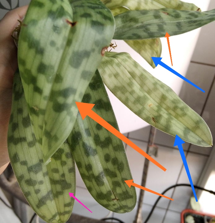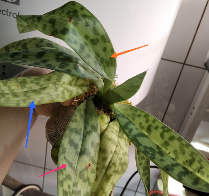 Верхние листья стали нормальной плотности и цвета (рыжая стрелка) . Средние пока (розовая стрелка) еще бледные и слабые, он был таким весь, нижние отмирают (синяя стрелка)