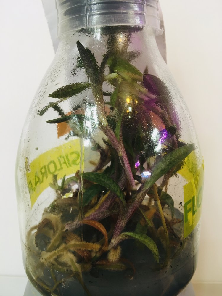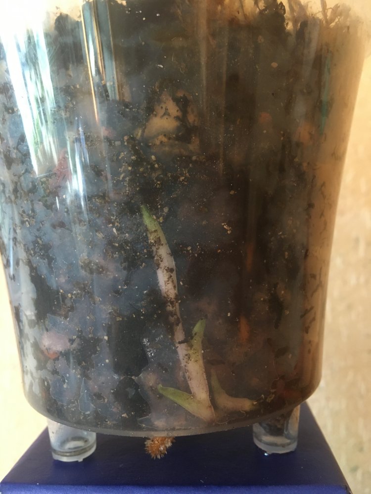 Кстати, насчет отрезать не такая уж и плохая идея. Верх попробовать укоренить в субстрате, благо корешок уже торчит, отсутствие точки роста должно стимулировать замещающую новую розетку, а уж ее светить, чтоб не вытягивалась. Я как то купила примерно такой, мне эта схема помогла. Башмак поставила на юго-западное окно+ подсветка. Выросла нормальная крепкая розетка.Верхние листья бодрые растут, крупнее сем нижние. Может отрезать и вводу - пустит корни?))