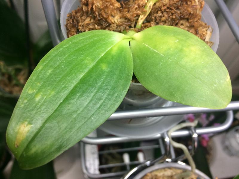 Хлороз и/или излишки солей в грунте: листья все становятся жёлто-зелёного оттенка, на коре в субстрате заметны солевые отложения, корни нормальные. Большое количество соли и кальция приводит к плохому усвоению железа, и растение начинает чахнуть.с хлорозом не знакома