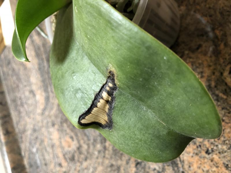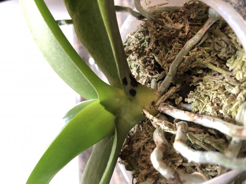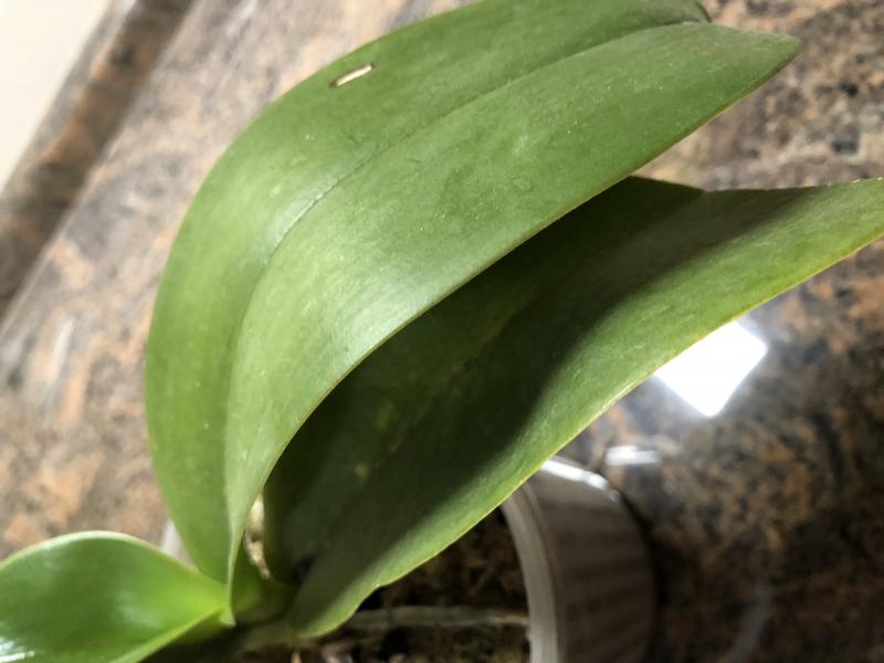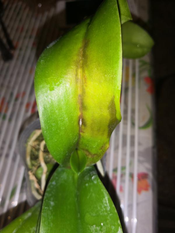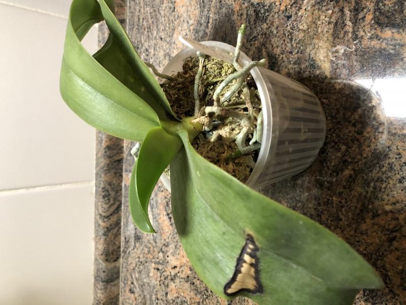 Это фаленопсис, выбросить который не смогла. Golden Peoker x (Prima Tabasco Tex) Peter, был в заказах в 14 году. После очень долгого лечения уже 2 года пребывает в таком состоянии, как на фото. Новый лист еле выползает, на нижнем сухие черные пятна (на среднем ожог). Здоровым растение назвать не могу, но и прогрессирующих признаков заболевания нет. Все старые листья с пятнами отпали (иногда сама убирала).
