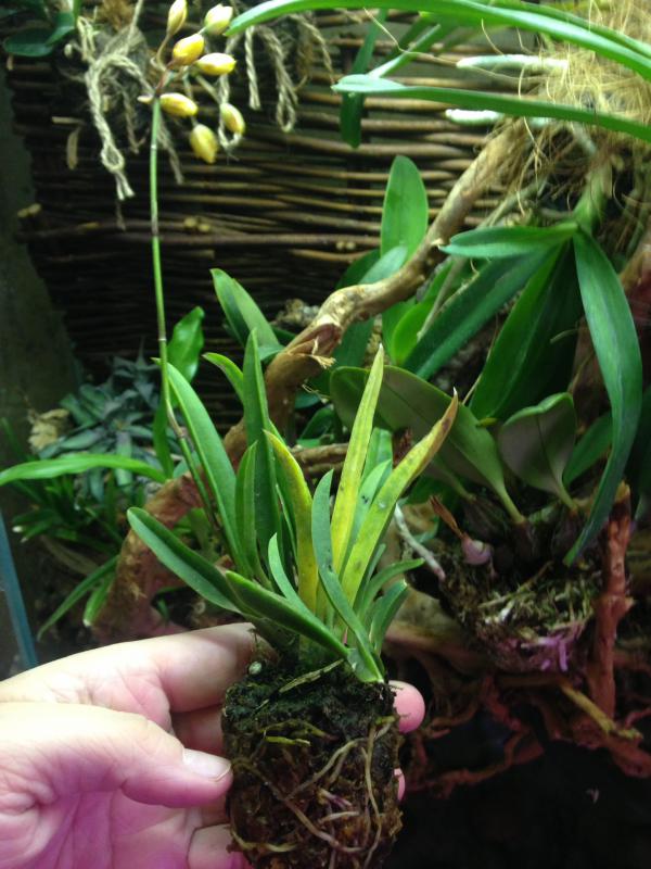 Уважаемые девушки, добрый день! Помогите пожалуйста. 11.07.16г., купила у нас в закупках на Юченге Oncidium.peloric-она же Зелемния Мидас как я поняла. Пришел бодрый кустик, но пара листиков была желтая, в темных пятнах, пришла в сухом мхе, я ее отмочила и поставила временно не пересаживая в орхидариум. Сегодня с утра, смотрю, что листья продолжают желтеть. Я ее освободила ото мха, обмотала не плотно кокосовым волокном, сунула в кокосовую половинку и поставила назад в орхидариум. У меня 6 толумний, все чувствуют себя замечательно, подскажите пожалуйста, что не так, очень хочется сохранить малышку!!!!!!!!!