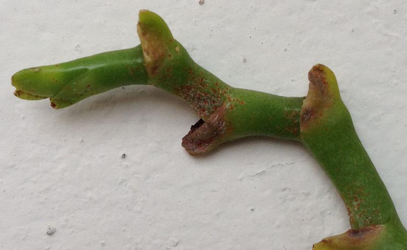Нещадно обгрызенная, а потом и ободранная, Лиодора успела отрастить 2 красивых новых листа. Впрочем, как и остальные. Всё прекрасно. Пристальный досмотр устраиваю по 2 раза в неделю всем без исключения. Но вот буквально на днях понадобилось освободить место для ремонта. Растения были составлены в кучу на балконе. Пробыли там 2 дня. И вот сегодня заношу их на место и опять вижу до боли знакомую картину... При чём на клещей и намёка не было. А за пару дней они успели чуть-ли не полностью сожрать цветонос у той же Лиодоры.