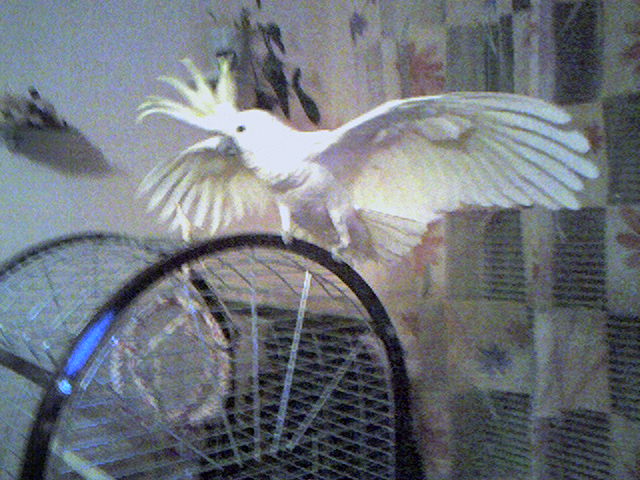 Когда Орел послушал, как рокочет Ро (видео с форума, там Ро много различных звуков издавал), он тут ТАКОЕ начал вытворять!!!!! Вопил, скакал с задранным хохолком, чуть клетку не разнес.