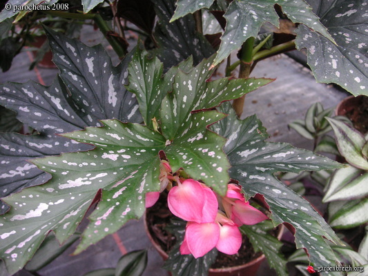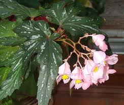 Кустовая бегония с красивыми сильно рассеченными листьями, покрытыми серебристыми вкраплениями, цветы бледно-розовые.