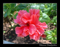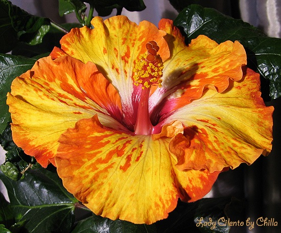 Ярко-розовый сорт с бледно-розовыми пятнами по краю лепестков и ярко-красной блестящей серединкой. Крупный 16-18см цветок с плотными лепестками. Мощный кустарник с огромными листьями. Сорт любит больше прохладу, чем жару. Нетерпимо относится к засушиванию земляного кома. Позднее нечастое цветение, достаточно неприхотлив.