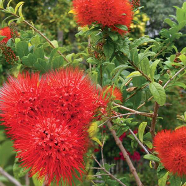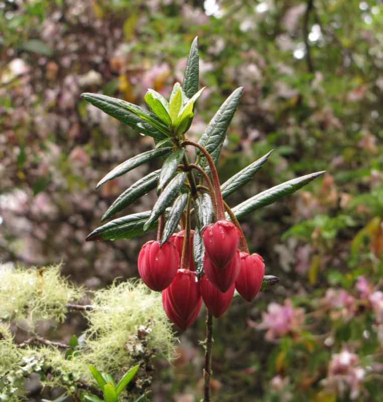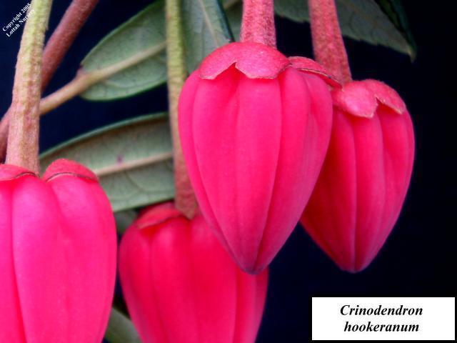 Кринодендрон Гукера или Трикуспидария (Tricuspidaria) - жесткий ветвистый кустарник или редко маленькое дерево с прямыми ветвями из семейства Элеокарповые ( Elaeocarpaceae ). Листья продолговатые, заостренные, зубчатые, темно-зеленые, 10 см длиной. Фонариковидные или воронковидные цветки мясисто-лепестные, ярко-красные или глубоко карминно-розовые, 2-2,5 см длиной. Цветение в мае-июне.