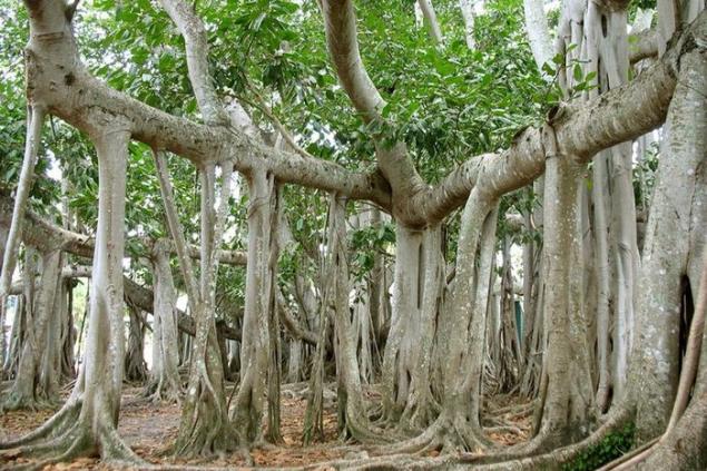 Фикус Бенгальский или Святой Баньян - дерево семейства Тутовые (Moraceae), произрастающее в Бангладеш, в Индии и на Шри-Ланке. Разрастаясь, он способен превратиться в большое дерево, занимающее несколько гектаров, имеющее окружность кроны длиной 610 метров. Для этого растения характерна особая жизненная форма — баньян. Формирование баньяна начинается с образования на крупных горизонтальных ветвях взрослого дерева воздушных корней, обычно не несущих корневых волосков. В определённые моменты жизни дерева их появляется очень много, и они гирляндами свисают с горизонтальных ветвей. Воздушные корни растут очень медленно, и через некоторое время большая часть их засыхает, так и не достигнув почвы. Единичные воздушные корни дорастают до земли и укореняются, после чего надземная их часть интенсивно утолщается, приобретая облик и проводящую функцию стволов.