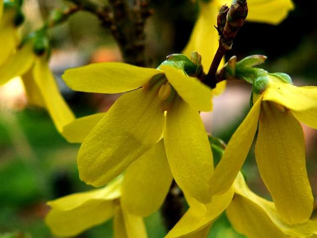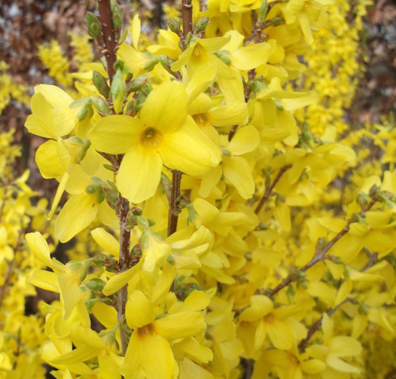 Форзиция (Форсайтия) промежуточная - род кустарников и небольших деревьев семейства Маслиновые, цветущих красивыми жёлтыми цветами. Родовое название дано растению в честь шотландского ботаника Уильяма Форсайта (англ. William Forsyth), занимавшего должность главного садовника Кенсингтонского дворца и ставшего одним из основателей Королевского Садоводческого Общества (англ. Royal Horticultural Society), — он привёз растение из Китая в Европу. Высота растений — от 1 до 3 м, изредка до 6 м. Кора серо-коричневая, грубая. Листья простые, изредка сложные (тройчатые), овальные, с зазубринами, супротивные. Длина листа — от 2 до 15 см. Цветки колокольчатые, ярко-жёлтые.