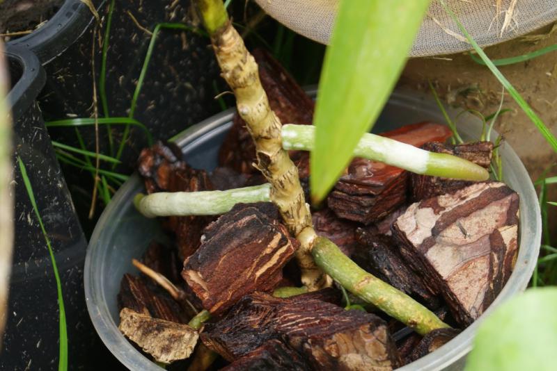 Корни, наросшие у ванды церулеи от "ствола пальмы" - ну т.е. ванда была в виде пальмы, ствол длинный а нижние листья опали. На "курорте" на даче под смородиной. И никаких витаминов и бона-фортов )))