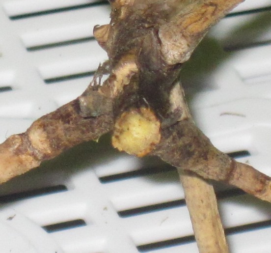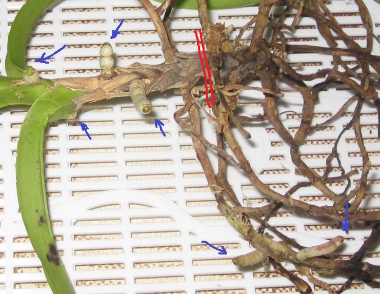 Ванда денисониана. Пришла в августе 14. Посажена в пластиковый горшок с дырчатым дном. Субстрат: кора + мох 1 см сверху. За 7 месяцев отрастила см 5 верхнего листа (на фото: длина стебля от нижнего конца до верхушки 12 см). Потом остановилась в росте, но дала новые корешки по стеблю плюс два отростка от одного из старых корней (второе фото - синие стрелочки). Предполагается отрезать по красной линии, оставив единственный работающий старый корень; все остальные корни - гнилые ниточки. При новой посадке (субстрат тот же) предполагается несколько заглубить стволик, чтобы новые корни тоже оказались ниже уровня субстрата. Цель - заставить расти новые корни, простимулировав сие повышением влажности вокруг них. Открыто они расти не хотят - пока я в отпуске, могу опрыскивать хоть 10 раз на дню; когда уйду на работу, такой возможности не будет. Да, и в квартире очень сухо...