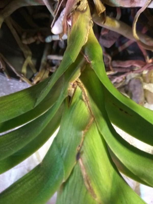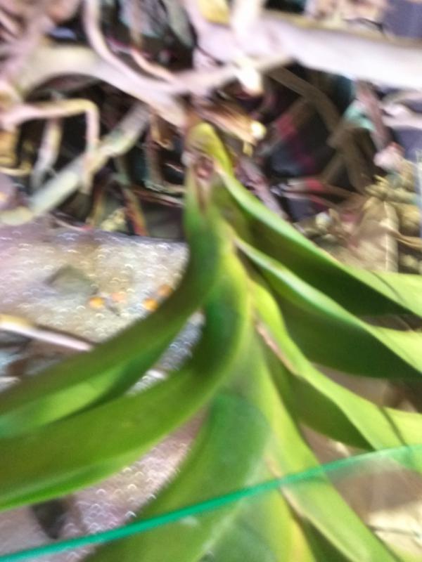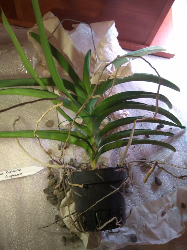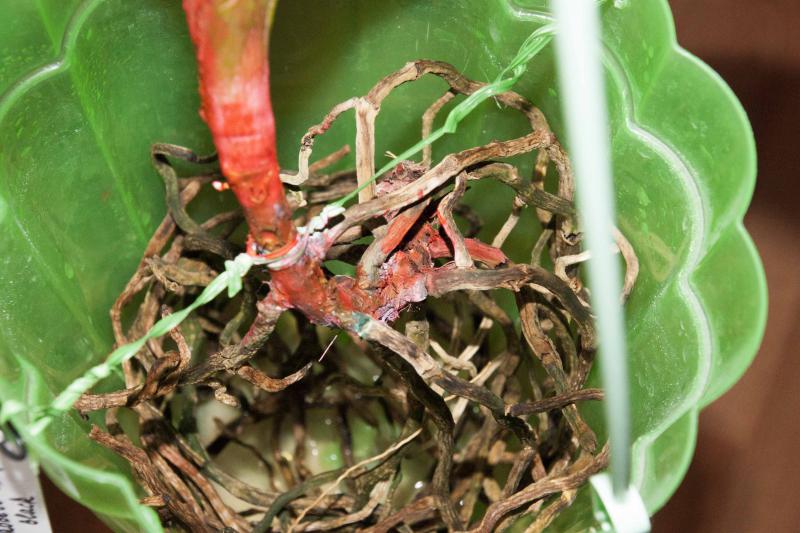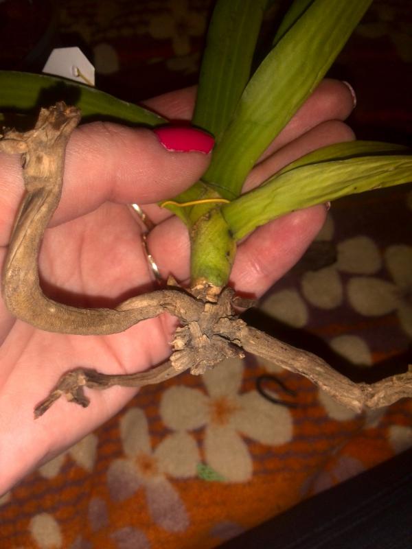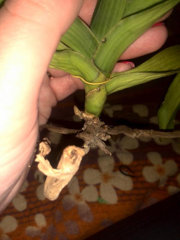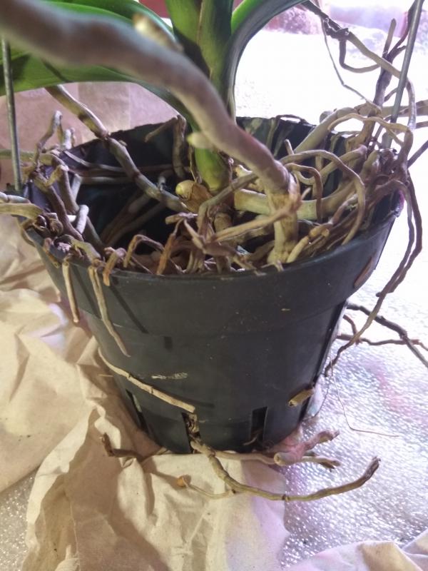 теперь корни - я бы не трогала, то есть вот этот сухой веламен не снимала. В пустой емкости он будет просыхать достаточно быстро. При поливе чистой водой корни тоже опрыскивать.
