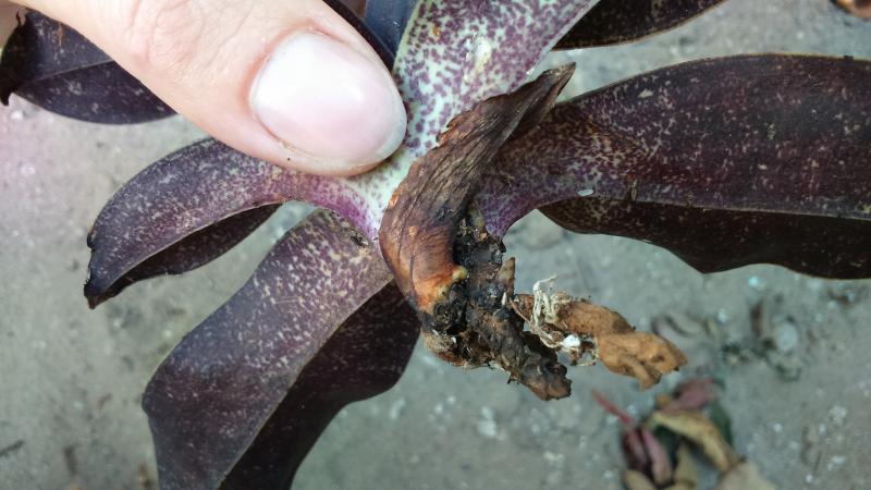 Здравствуйте. В прошлом декабре купила простой американский гибрид. Отлично рос,весной выпустил чехол и засушил его - думаю из за жары. А вот на новых ростах появилась такая бяка. Розетка в ступоре - не растет. Причем это вторая молодая розетка. Первая в таком же состоянии. Пересадила - корни отличные и их много. Пролила 2 раза фундазолом. Изменений никаких. Что это может быть? 20161022_101651.jpg20161022_101712.jpg