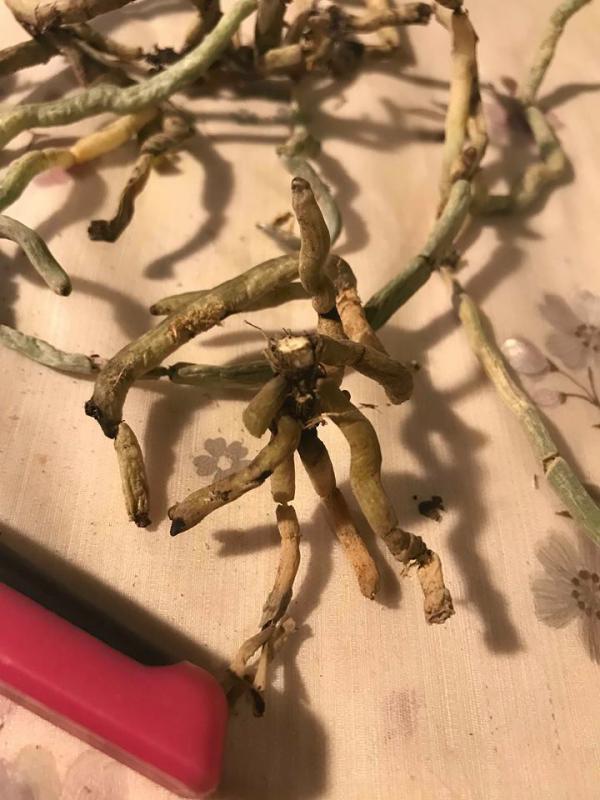 То есть таким образом стараюсь укоротить растение, чтобы его было можно посадить нормально, не заглубляя опасный участок, чтобы не мочить при поливе и чтобы там все хорошо проветривалось, ну и чтобы растение держалось в горшке лучше. Потому что заглублять такую шейку я бы все-таки не рискнула и если сажать такое над корой, то растение будет заваливаться. Но, конечно, тут на Ваше усмотрение.