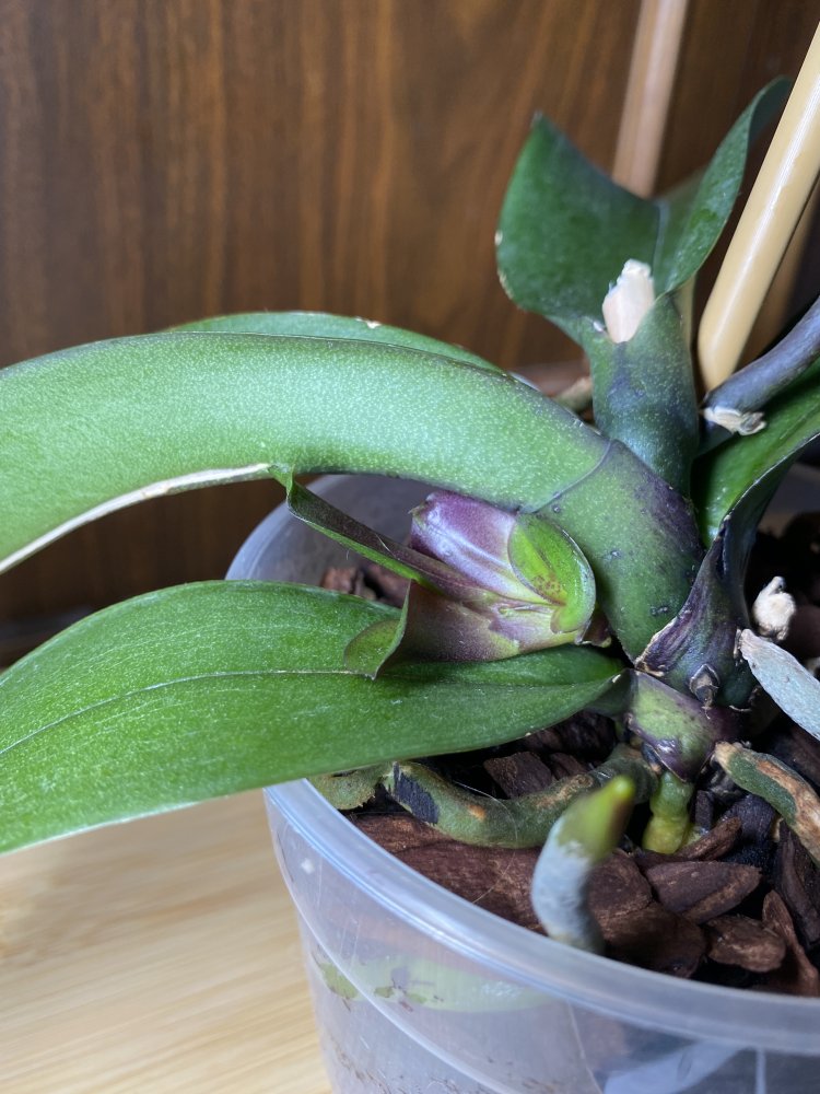 Добрый день! Подскажите, пожалуйста, по поводу фаленопсиса. При покупке у него имелся мясистый цветонос, идущий из центра, на котором располагался маленький лист, а сам цветонос шел из крупного влагалищного листа. Был период, когда за ним плохо ухаживала, пересушивала, растение плохо себя чувствовало, но пыталось цвести. По глупости срезала тот первый цветонос. В течение года орхидея давала несколько боковых цветоносов, наращивала корни, но ни разу не давала новых листьев. Несколько недель назад выдал вот такое (на фото). Подскажите, пожалуйста, это детка или это просто новые листья? Первый раз встречаюсь с таким фаленопсисом, до этого имела знакомство только с теми, кто наращивал листья сверху. Если это детка, то как у таких фаленопсисов вообще появляются новые листья? Буду очень признательна за ответ!