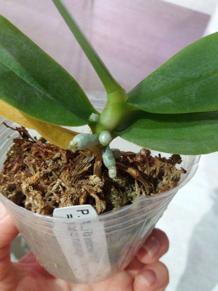 Подскажите, что делать с фаленопсисом. При получении хорошее растение. Не пересаживался, полив по мере просыхания мха. Вот вижу, что хочет жить, проклевывает корни из всех щелей, но не отращивает, все закукливает. Мох его не устраивает? Корни внутри мха вероятно погибли, в горшке ничего не видно.