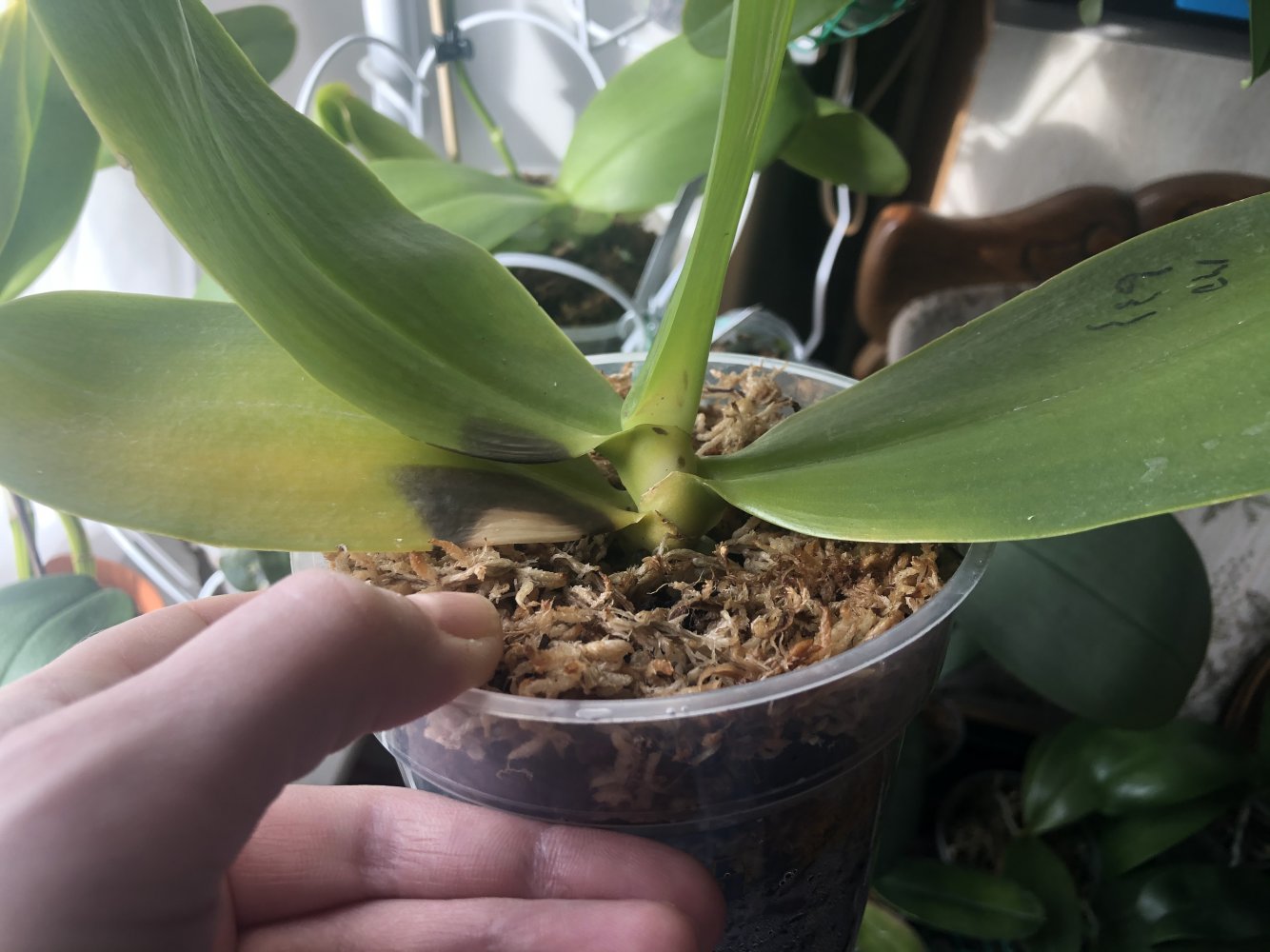 На той неделе солнышко подпалило растюху.Увидела через пару дней высветленные немокнущие ожоги.Ну,думаю,просто засохнет всё это дело и всё.Ничего не делала с этим,просто притенила.Растение чувствовало себя хорошо.Сидело в стаканчике,в котором приехало с лета.Корней много,решила перевалить в горшок.Свежий мох,кора.Пролила на следующий день.И вот,что имеем сейчас