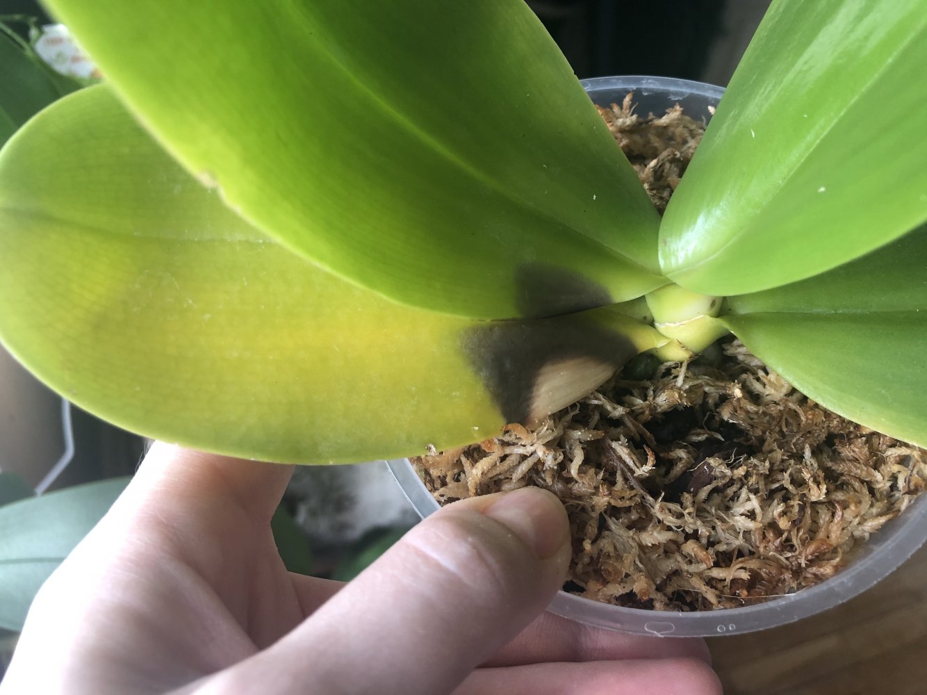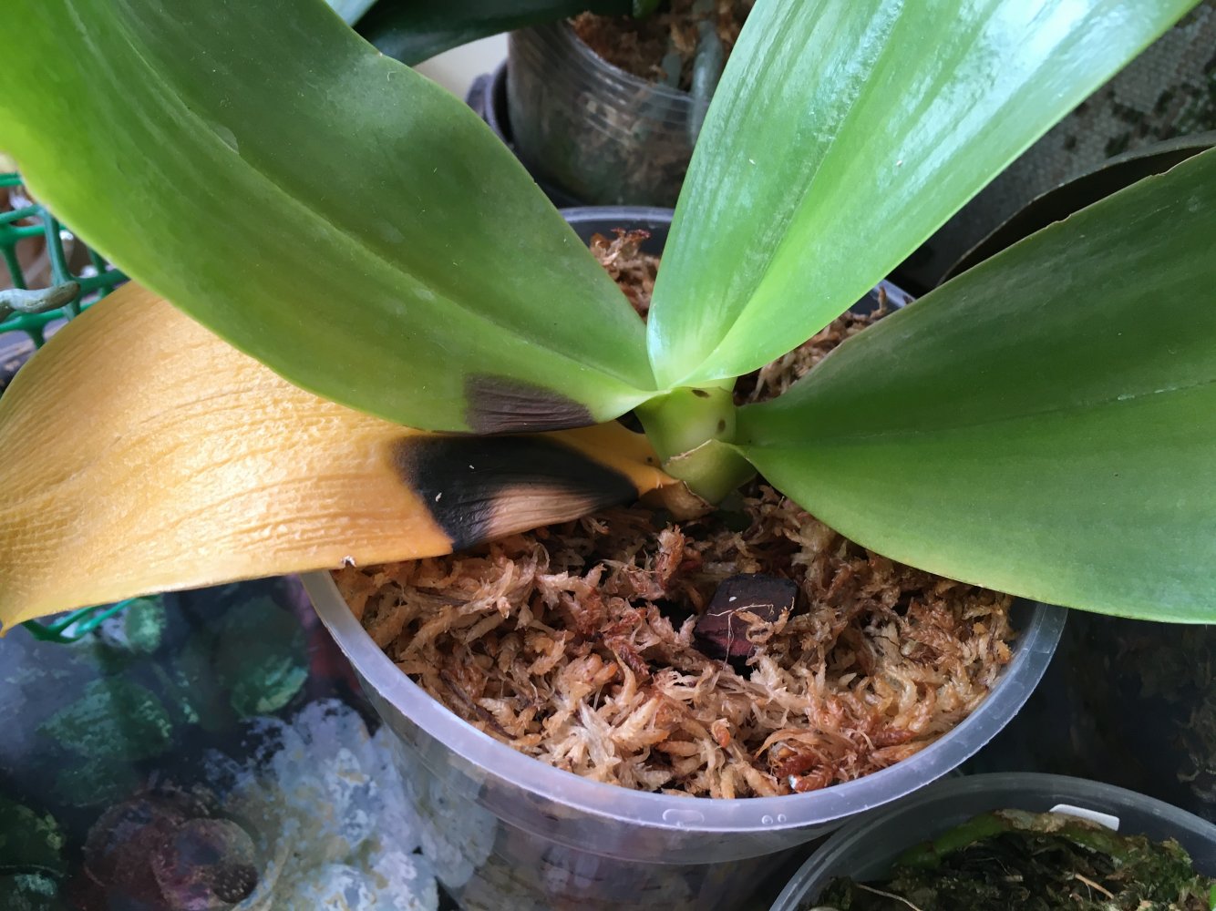 Лист нижний желтеет.Это от ожога или зараза какая села?Ещё ведь пересадка была