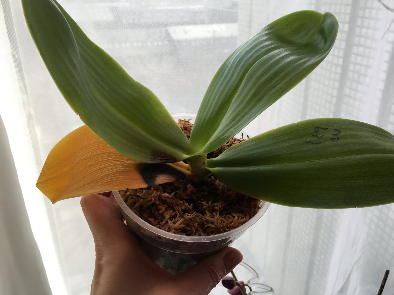Листья в тургоре,торчком.И даже желтеющий лист такой упругий.Мне кажется даже,что растень не заметил пересадки.Но вот пожелтение беспокоит.Митушный красавец