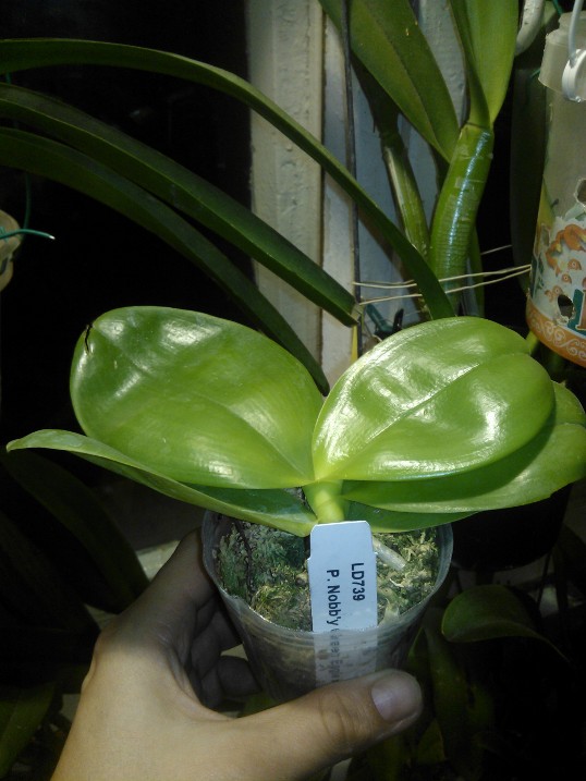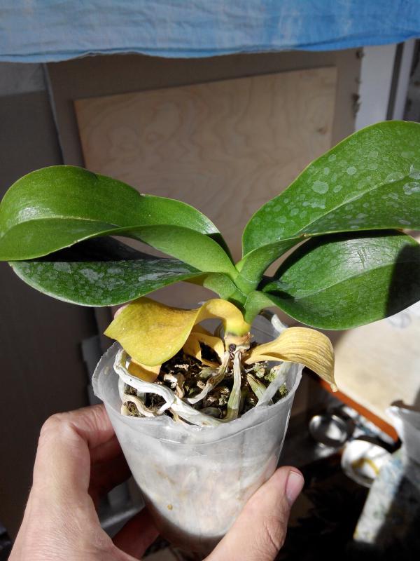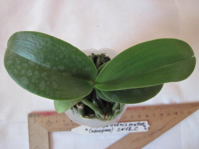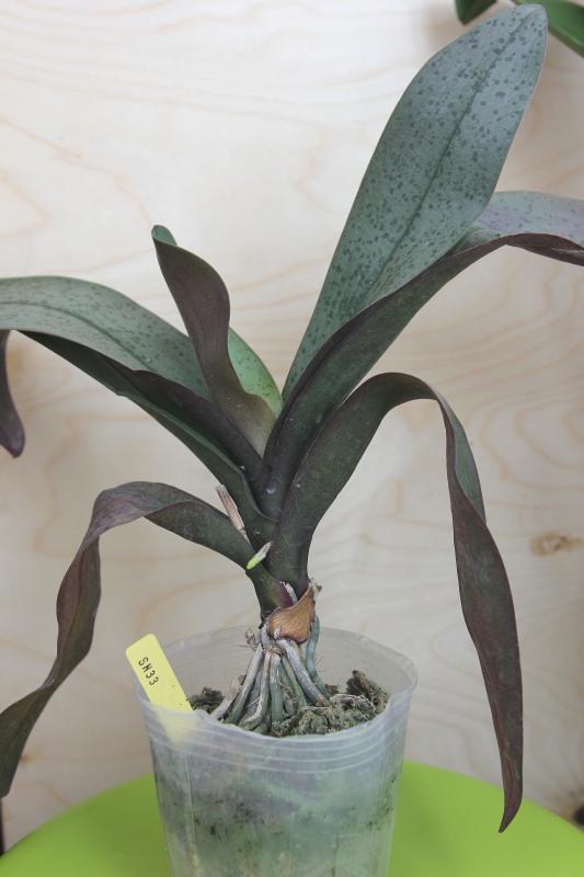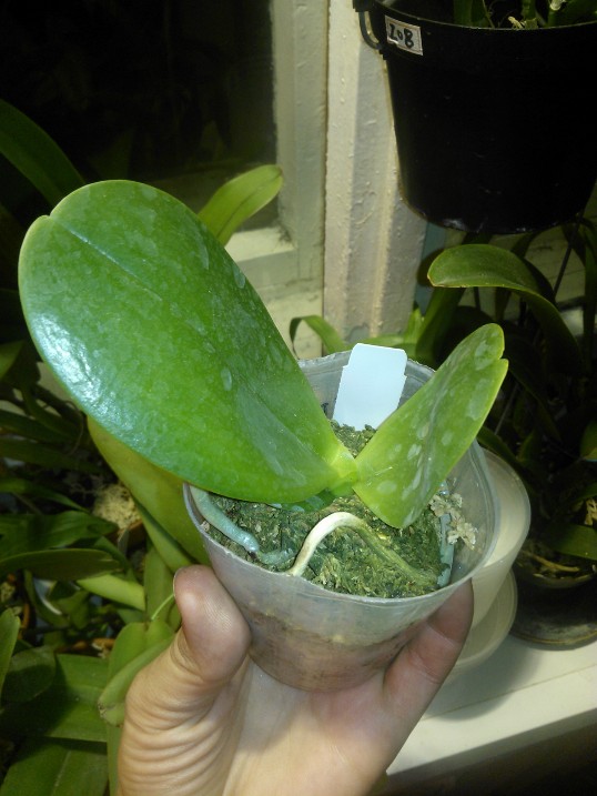 1. Phal. Sogo Gotris mutation. Правый наобщем фото. 5 и 1 растущий лист. Много отличных корешков. Калачиком свернулся цветоносик снизу, будем пробовать уговаривать зацвести.
