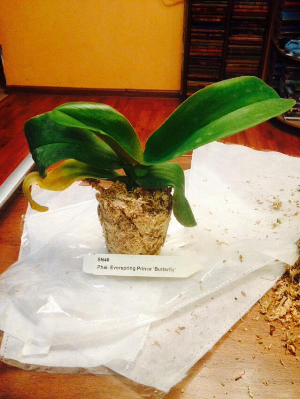 Заказываю также второй раз. В первый раз погиб по моему недосмотру (полила на ночь летом и под кондиционер. За ночь съела бактериалка). Шикарный фаленопсис, нижний лист начал с кончика желтеть - но ничего страшного, другие 4 листа в прекрасном состоянии. Цветения никогда не было. Много корней. Суховаты. Отпоила