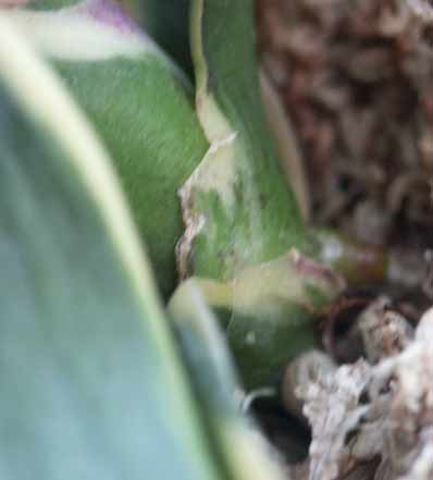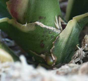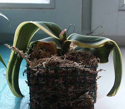 Но если посмотреть внимательнее - лезет молодой лист и он вполне бодрый. А если чуть отодвинуть субстрат видно 2 новых корешка.