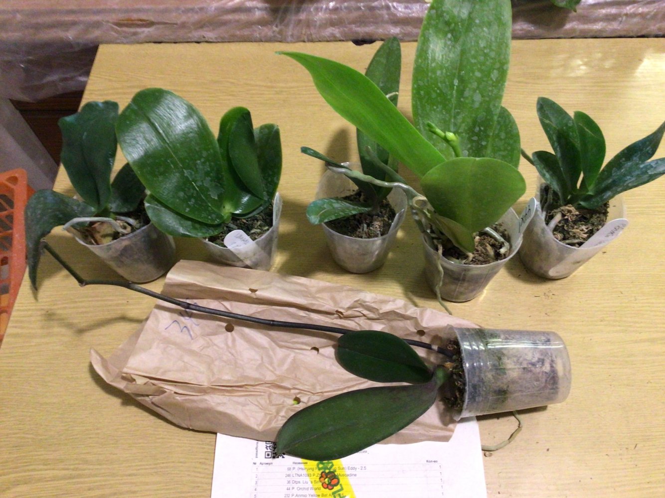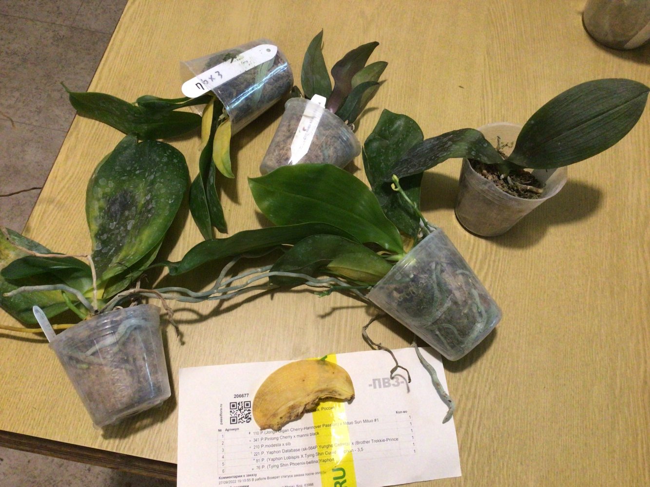 Заказ 206677 от 02 сентября. Получен вчера в день смс. Часть растений требует особого внимания. Особенно не порадовал P. (Yaphon Lobispis X Tying Shin Cupid) (самый правый), который вместо 3,5 похоже свежепересаженный 1,7, так как корней не видно. А листья в плохом состоянии, не уверена, что у него хватит сил на акклиматизацию.(