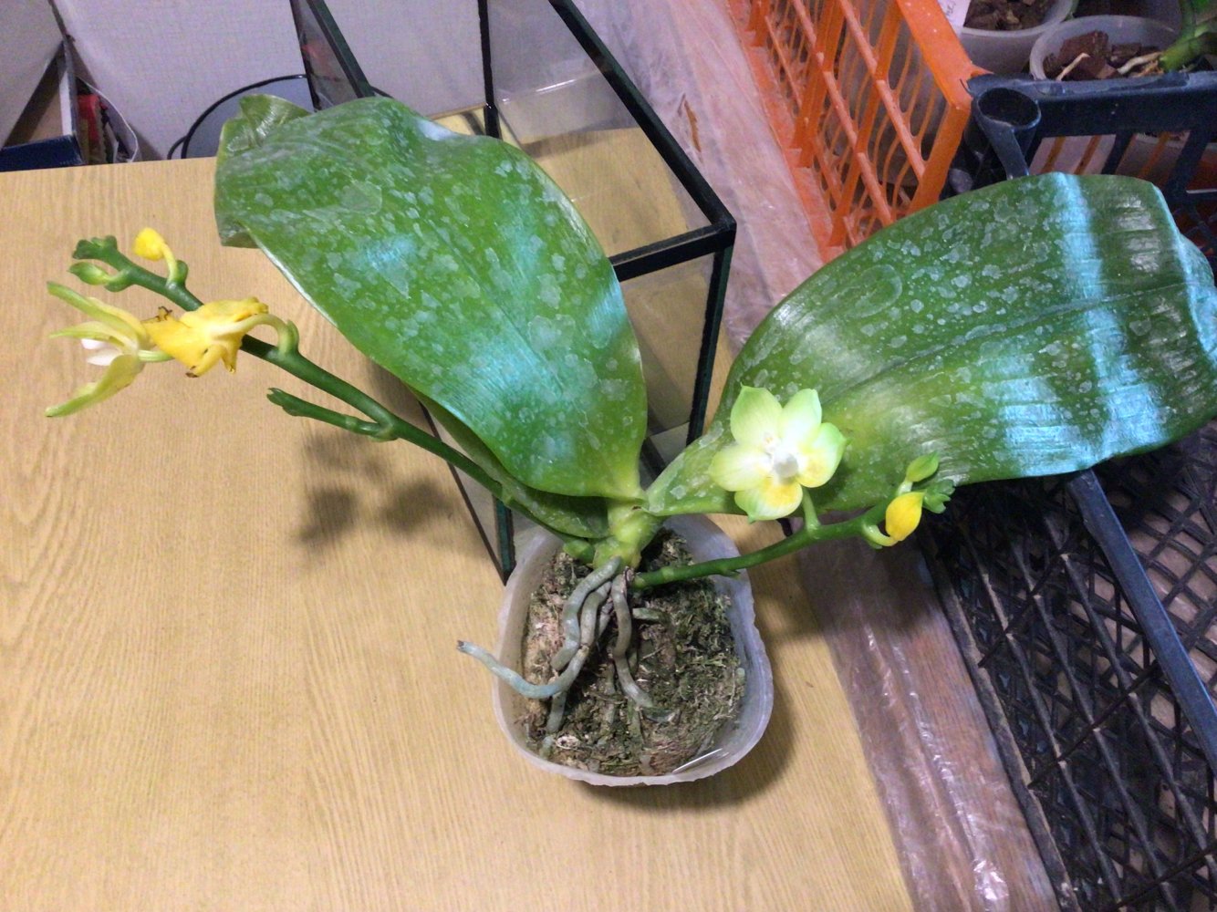 Giga King тоже был хорош, корни оплели весь мох, но ни одного живого, подгнили, центральный лист отпал когда протирала, тоже подопрел. Остальные в очень хорошем состоянии, развитая корневая, на листьях только точечные следы, видимо, конденсата, почти все с цветоносами.
