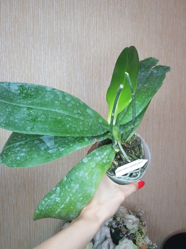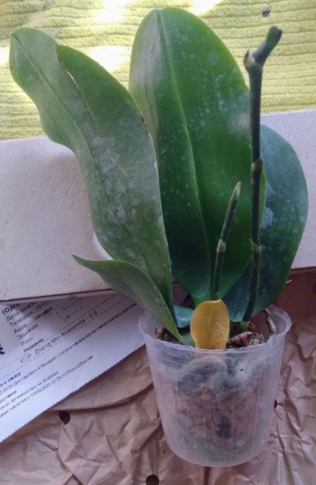 Быстрый заказ всего 2 месяца от оплаты до получения. Заказала растения после того как увидела его на видео на ферме Яфона. Получила просто гигантское растение в горшке 3.5 много корней, два срезанных свежих цветоноса, виден старый третий цветонос. Есть фирменная бирка с названием. Живности не обнаружила. Мох сухой. Листья очень большие, 7 штук. Минус в том что у всех 6ти полученных растения от яфона имеются какие-то проблемы с корнями.