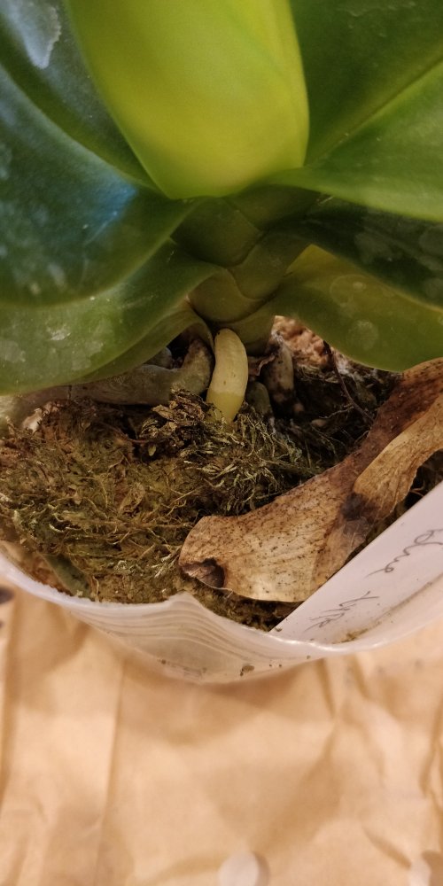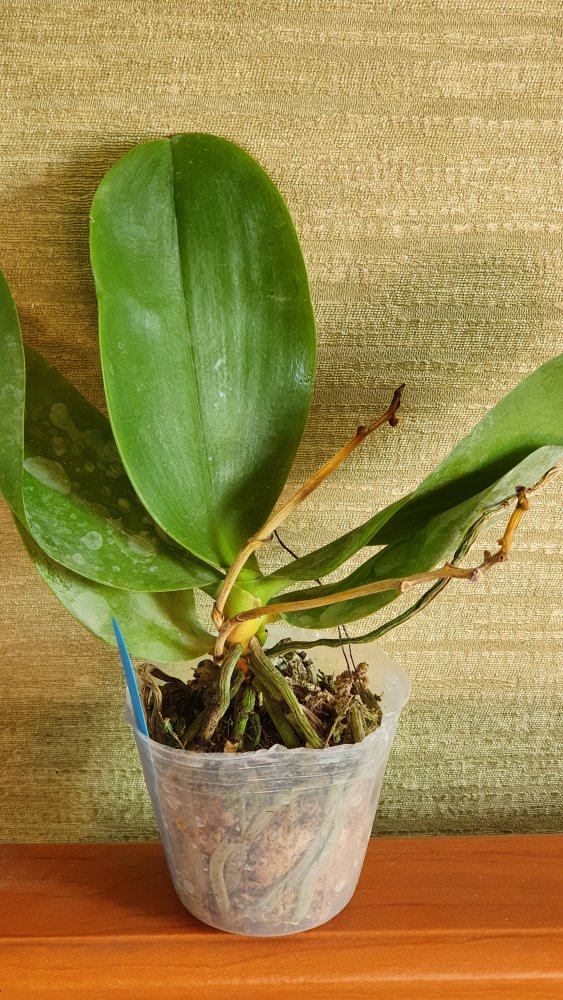Два небольших растения, похожи на подростков, не цвели, нижние листики спрели, корней не видно. Мох сухой.
