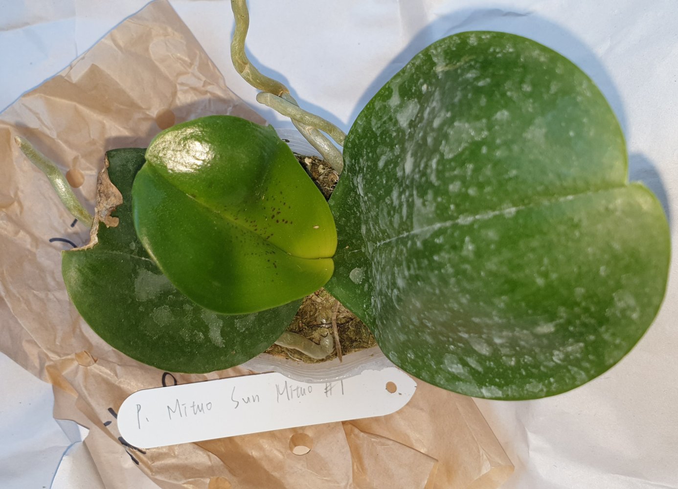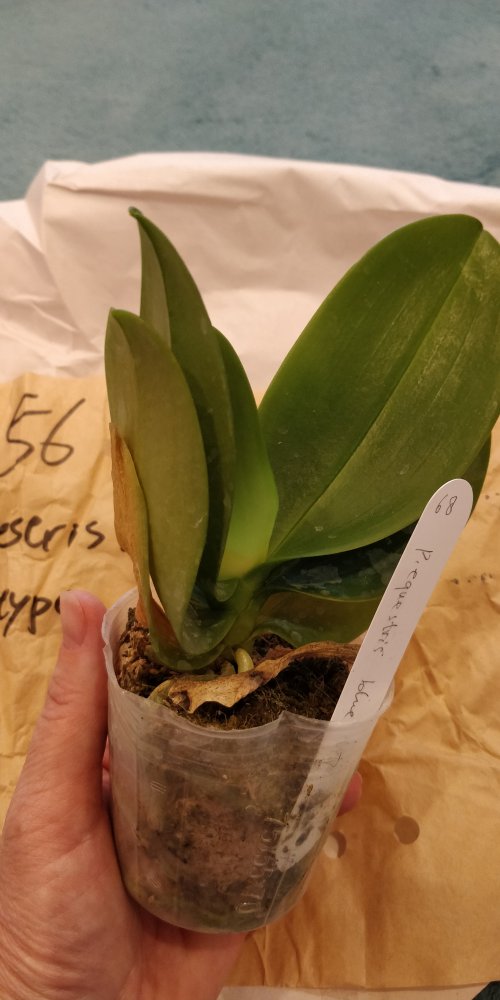 Обе орхидеи в размере 2.5. Идеального качества. Листья до 15 см. Чуть снижен тургор. Сухой мох. Отличная упаковка с названием сорта и кодом растений. Рукописные бирки от поставщика. Очень довольна качеством растений и упаковкой. Спасибо .