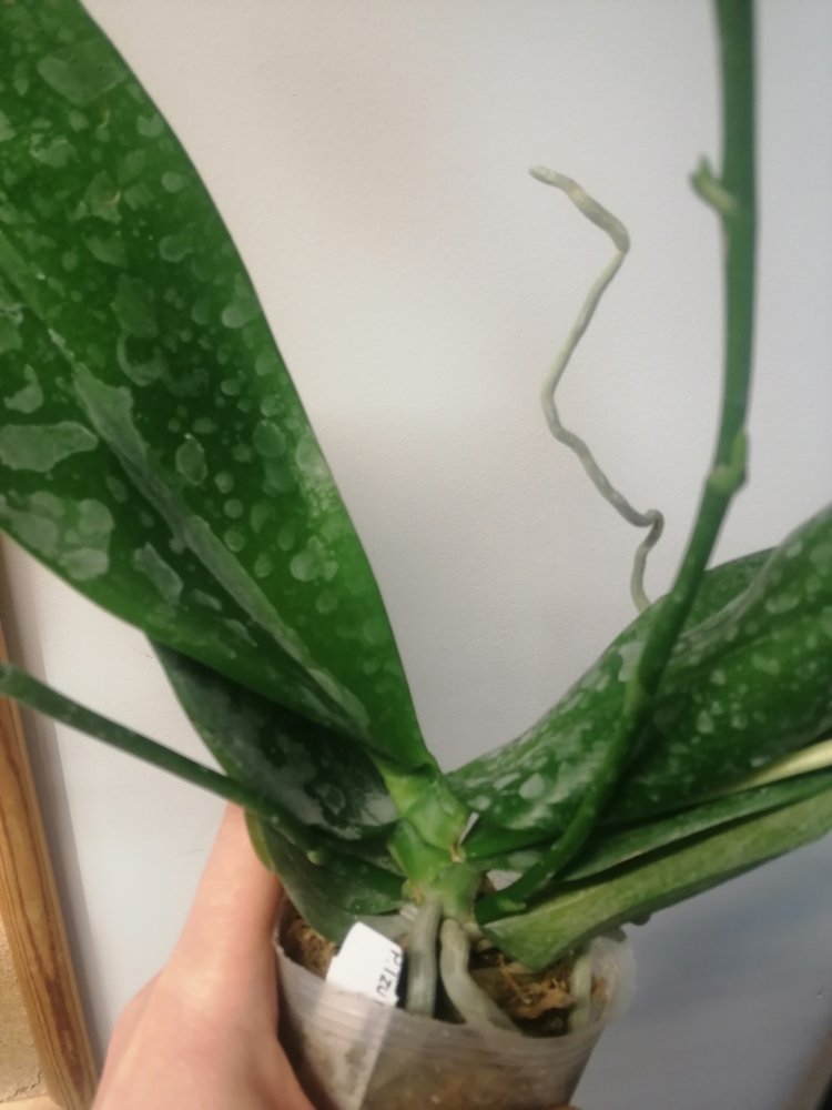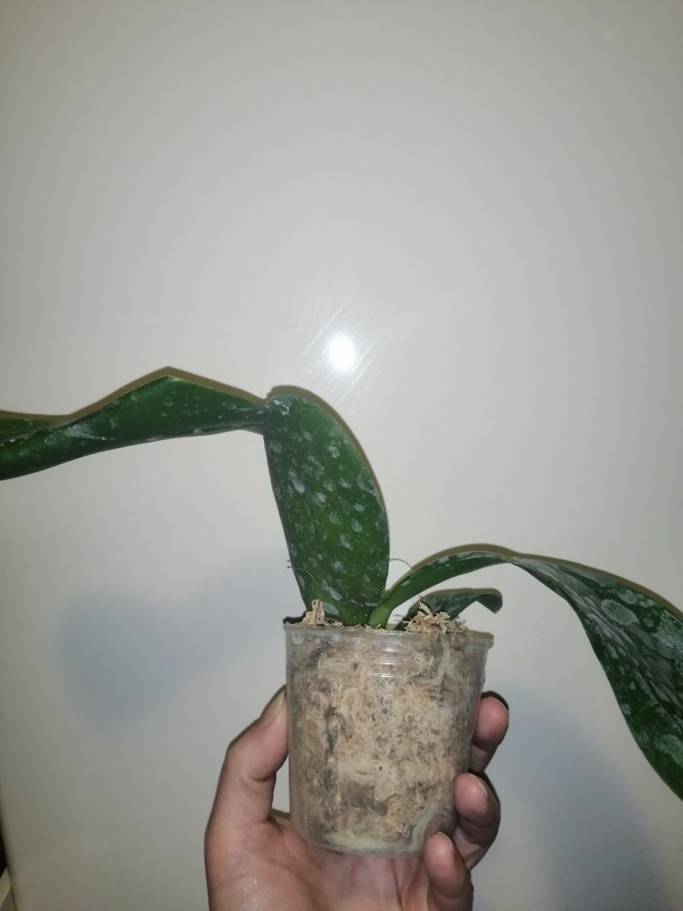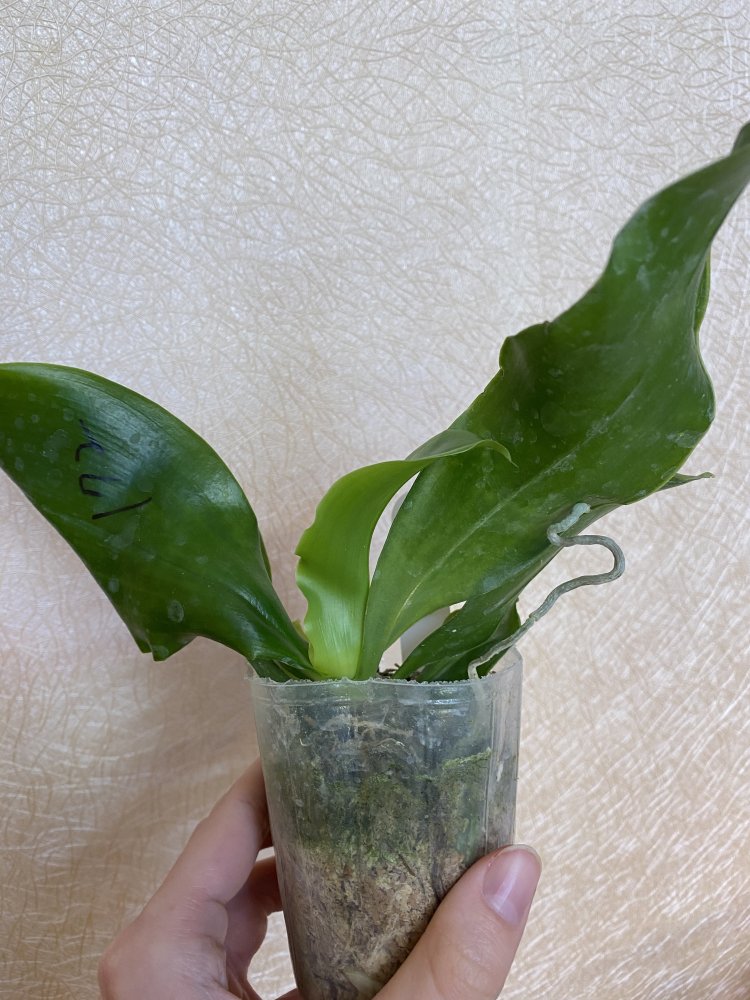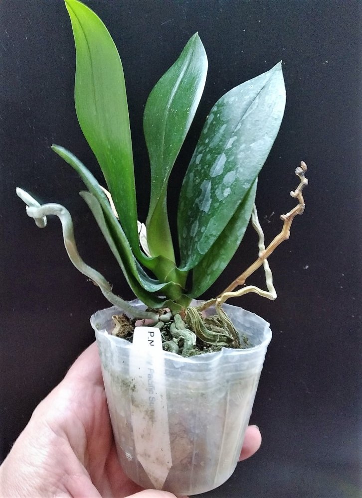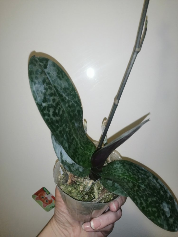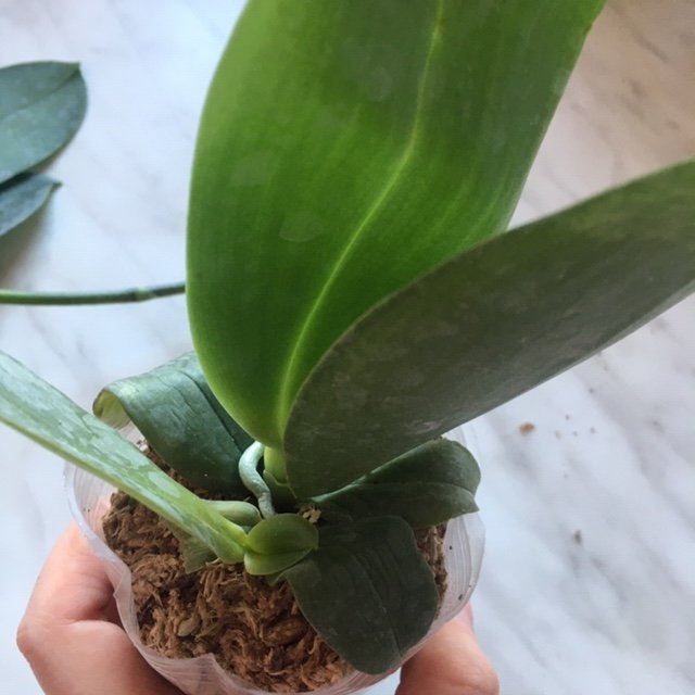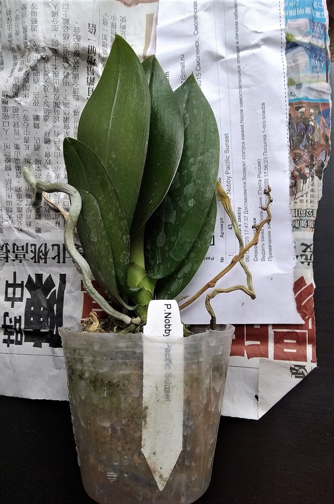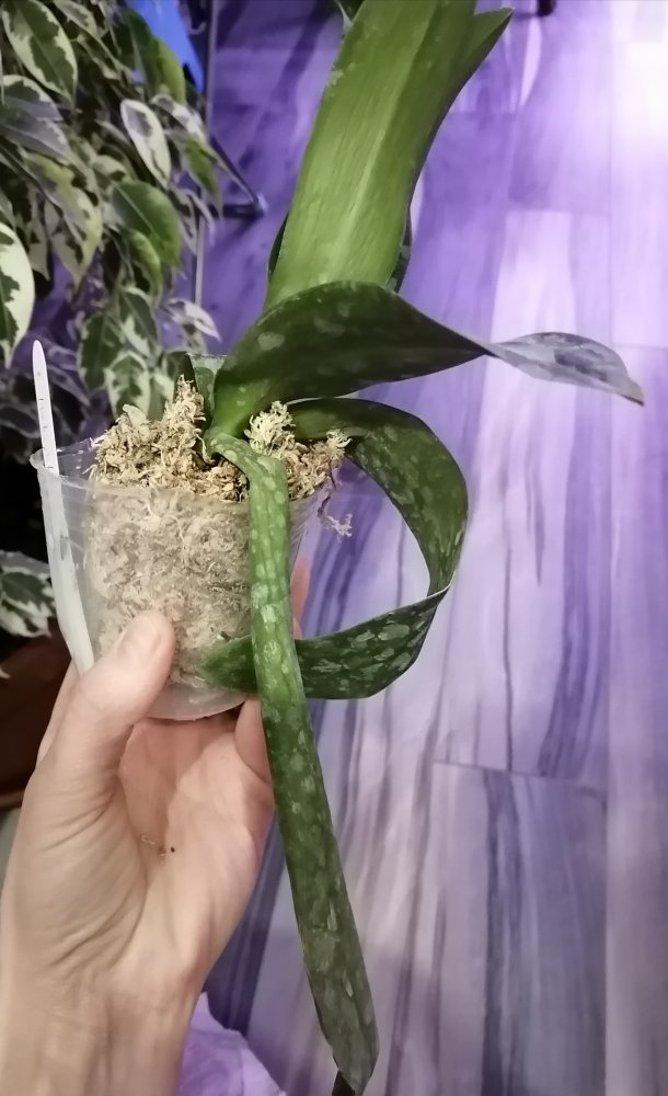 Размер 3,5! Огромная! 3 широкие листа: 20, 20 и 30 см! Тургор незначительно снижен. Мох сухой. Корни чуть высохли, но отопьются. Замят и сломан край у большого листа при упаковке. В остальном прекрасная орхидея за такую небольшую цену. Спасибо Пассифлора.